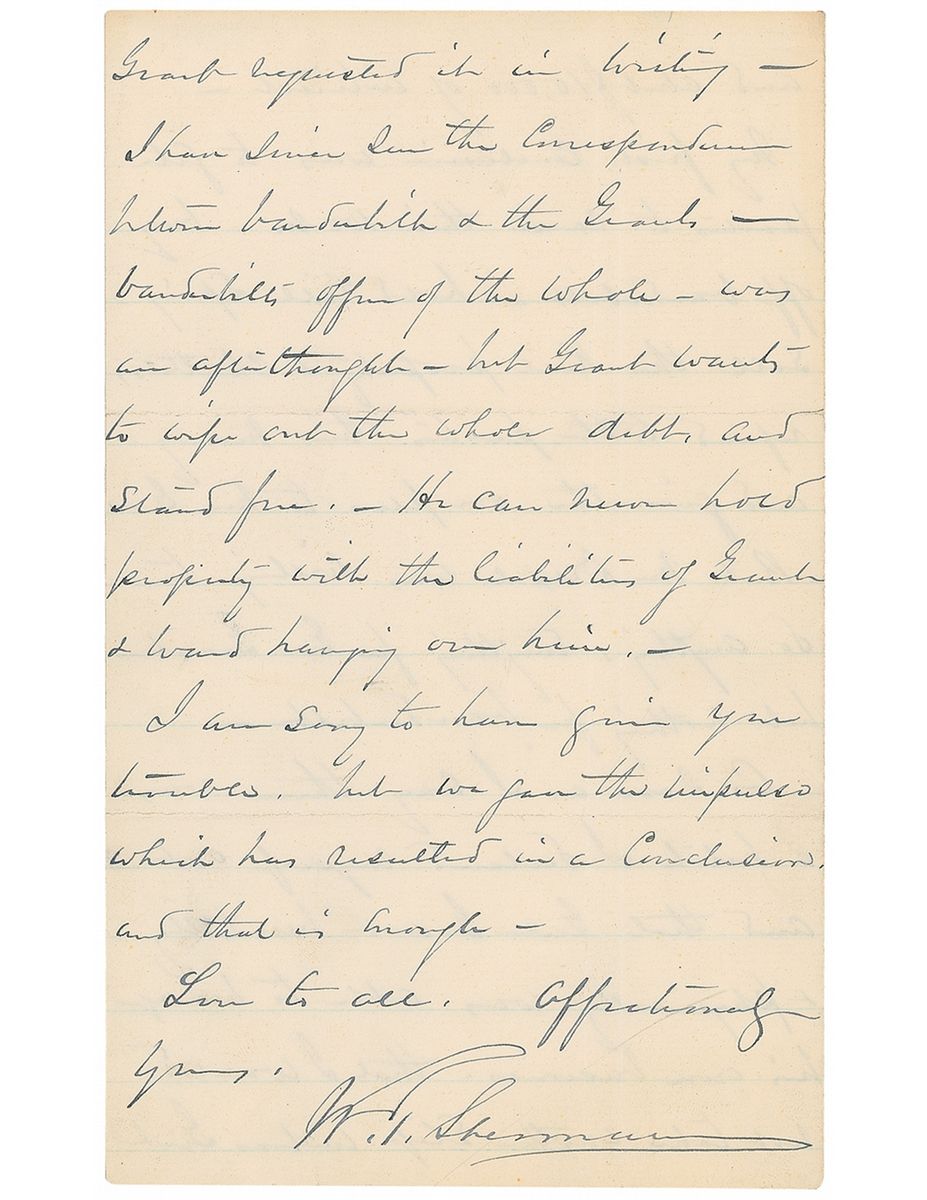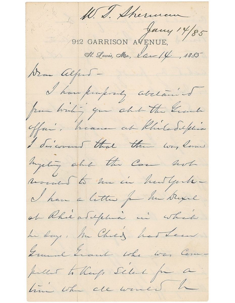 ALS signed “W. T. Sherman,” four pages, lightly-lined on two adjoining sheets, 5 x 8, 92 Garrison Avenue letterhead, January 14, 1885. Letter to Alfred discussing U. S. Grant’s financial troubles. In part: “I have purposely abstained from writing you about the Grant affair because at Philadelphia I discovered that there was some mystery about the case not revealed to me in New York. I have a letter from Mr. Drexel of Philadelphia in which he says Mr. Child had seen General Grant who was compelled to keep silent for a time when all would be revealed satisfactory to his friends etc…Genl Dodge…said his information came from Genl Grant’s house, and that he himself saw the Sheriff’s office at the house…Now Mr. Depew told me that Mr. Vanderbilt was anxious to get rid of the whole thing and offered to sell his judgement for $100,000 thereby throwing off $50,000 of principal and about $10,000 of interest.