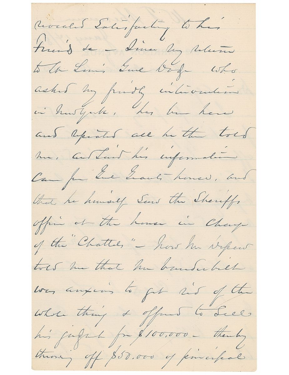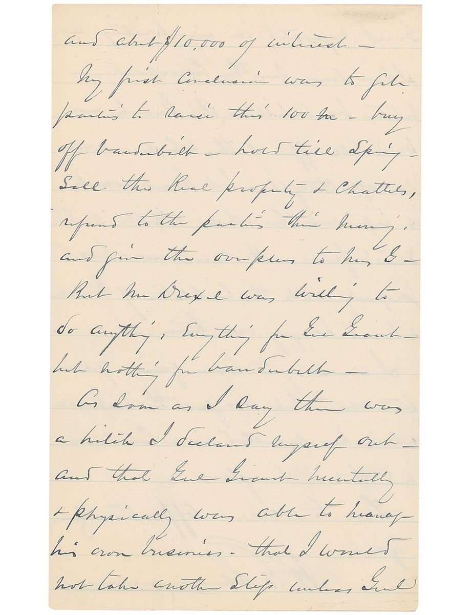 My first conclusion was to get parties to raise this 100 th[ousand], buy off Vanderbilt, hold till Spring, sell the real property…But Mr. Drexel was willing to do anything, everything for Genl. Grant, but nothing for Vanderbilt. As soon as l saw there was a hitch l declared myself out, and that Genl Grant mentally & physically was able to manage his own business, that l would not take another step unless Genl. Grant requested it in writing. I have since seen the correspondence between Vanderbilt & the Grants. Vanderbilt's offer of the whole was an afterthought, but Grant wants to wipe out the whole debt and stand free. He can never hold property with the liabilities of Grant & Ward hanging over him. I am sorry to have given you trouble. ” In fine condition, with two vertical folds to left side and an ink notation at the top of the first page, presumably by the recipient.