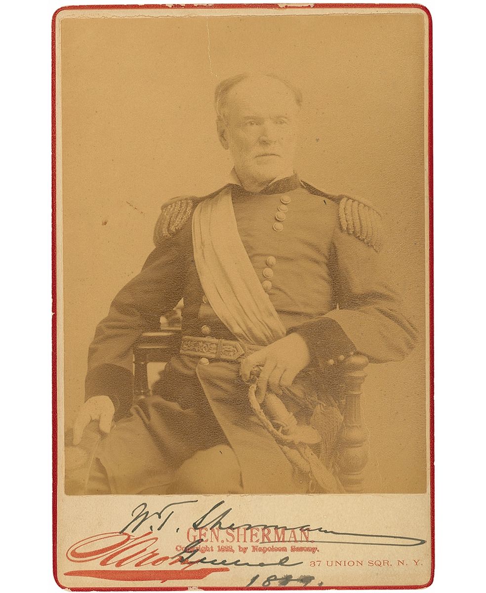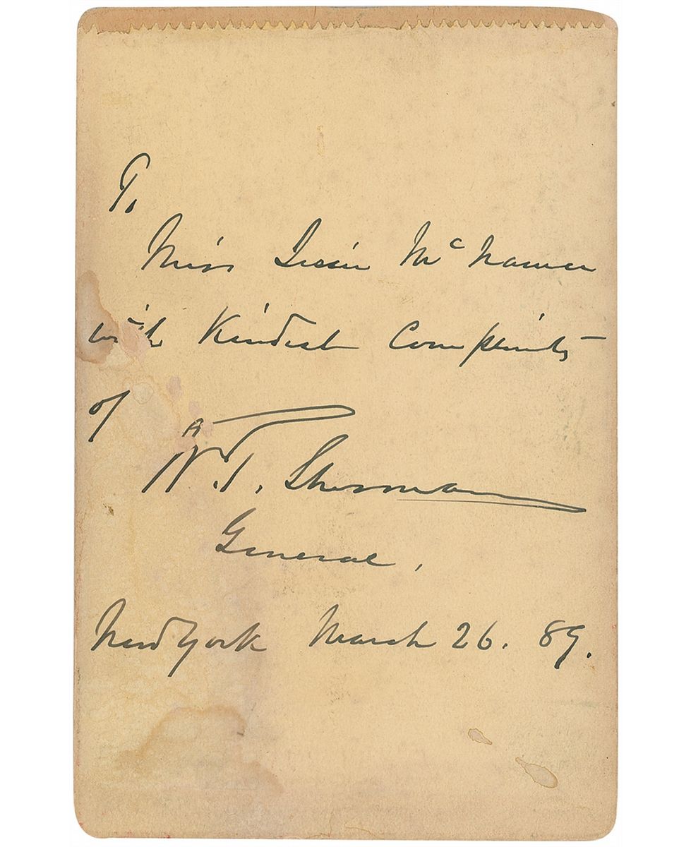 Original sepia 4 x 6.5 cabinet photo by Sarony (copyright 1888) of Sherman in full military uniform, signed in black ink in the lower border, “W. T. Sherman, General 1889.” Photo is also signed and inscribed on the reverse, “To Miss McNamer, With kindest compliments W.T. Sherman, General. New York, March 26, 89.” In very good condition, with a vertical crease extending from top edge into facial area, a light crease to bottom, scattered light crazing, some silvering to darker portions, visible only at an angle, some light feathering to date on front, and scattered light soiling, dampstaining, and toning to reverse, lightly affecting one word of inscription. In 1886, two years after retiring from military service, Sherman moved to New York City, where he lived for the remainder of his life and where he was in great demand as a speaker and dinner guest. In 1888, he sat for Napoleon Sarony (1821–1896), the city’s undisputed king of celebrity photography. Sarony captured multiple views of Sherman in full uniform, including the present portrait.