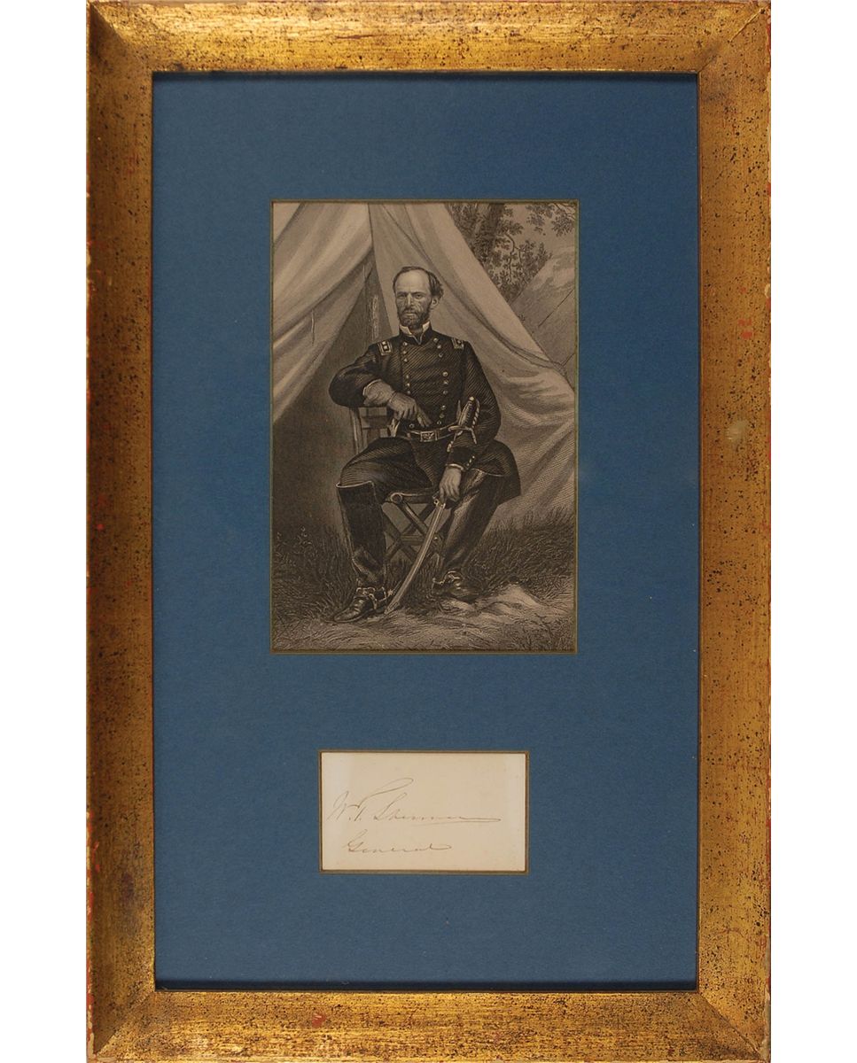 Ink signature, “W. T. Sherman, General,” on an off-white card. Matted and framed with an engraved portrait of Sherman to an overall size of 10 x 15.5. In very good condition, with a mild block of toning over signature.
