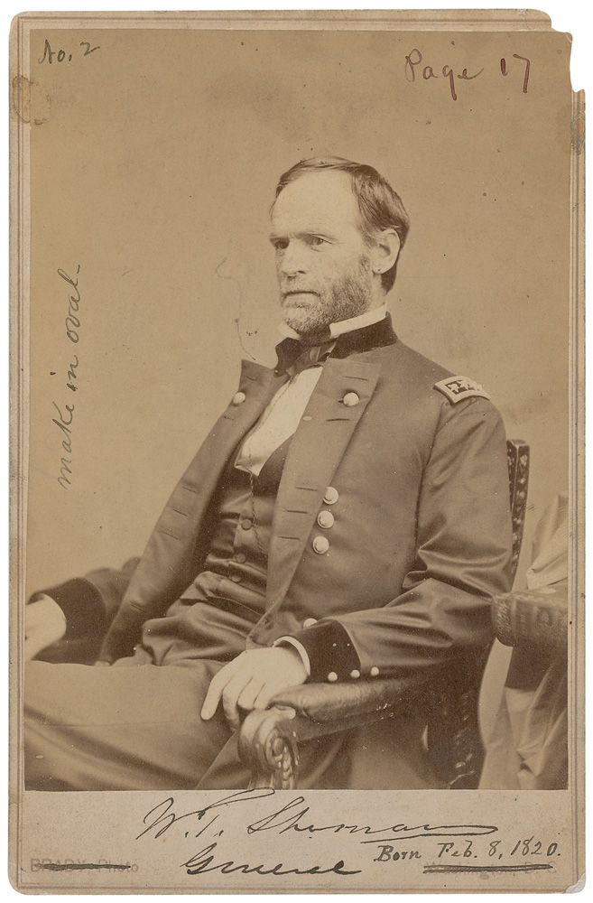 Famed Union general (1820–1891) best known for his devastating campaigns in the deep South, including the ‘March to the Sea,’ that led to the capture of Atlanta and Savannah and proved to be one of the turning points of the Civil War. Stoic original 4.25 x 6.5 cabinet photo of Sherman, dressed in full uniform, seated in a chair, by Brady of Washington, signed in the lower border in black ink, “W. T. Sherman, General.” Several notations are along the borders of the image read “No. 2.,” “Page 17,” “Born Feb. 8, 1820,” and “Make in oval,” with the photographer’s information in the lower border crossed out, apparently by Sherman. A notation on the reverse in an unknown hand reads “Return this photo as soon as drawn.” In very good condition, with edge loss to top right corner, a few spots, some mild silvering to darker areas, and some light toning and soiling to bottom border. Photo dates from around 1866, as Sherman was promoted to the rank of lieutenant general at that time. Cabinet photos, particularly from Brady, were quite popular during this period.