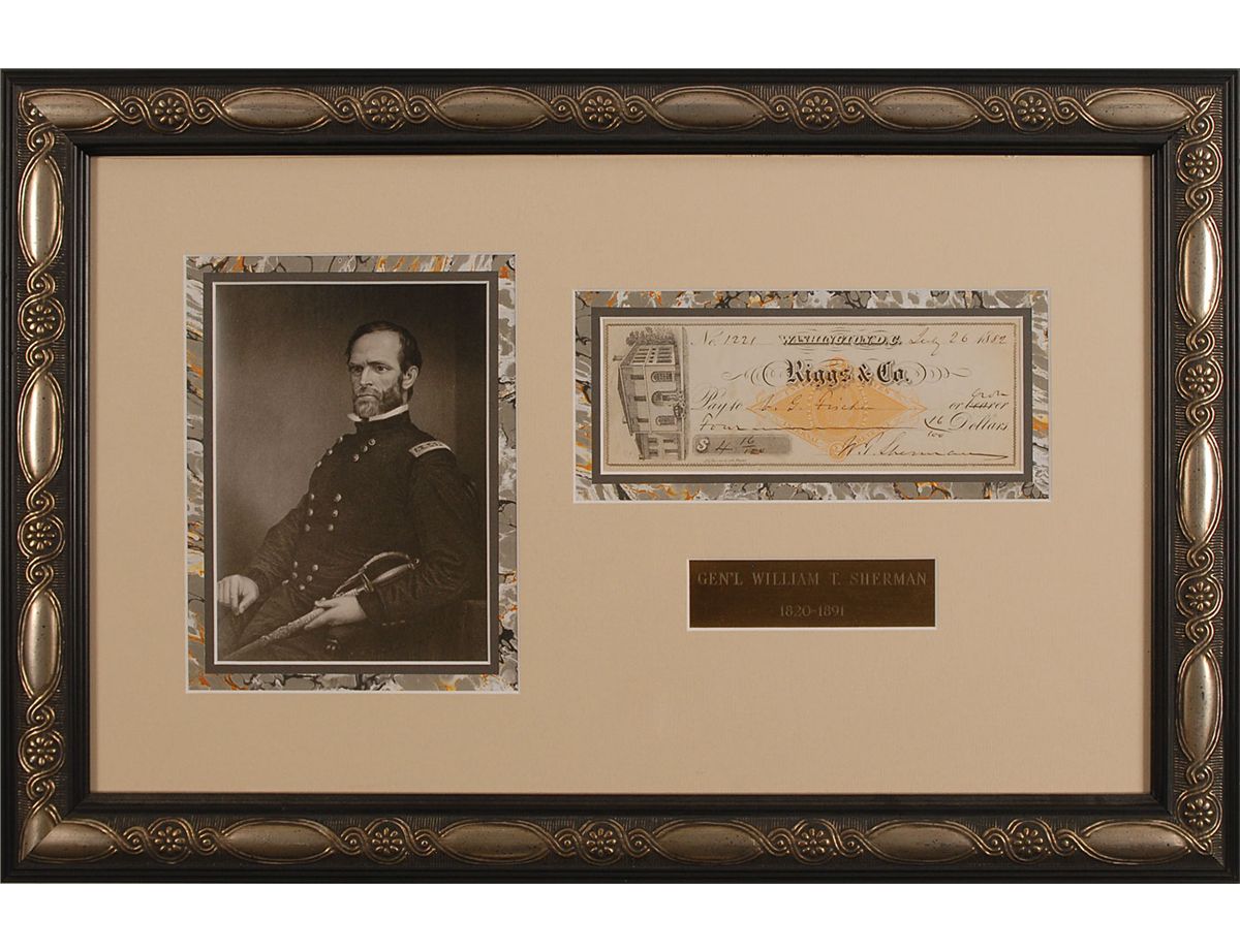 Riggs and Co. bank check, 7.25 x 2.75, filled out and signed by Sherman, “W. T. Sherman,” payable to V. G. Fischer for $4.16, July 26, 1882. Triple-matted and framed with a portrait of Sherman and a small plaque to an overall size of 21.75 x 14.5. In fine condition, with cancellation cut to center of check, and a second crisp cancellation touching a couple letters of signature.