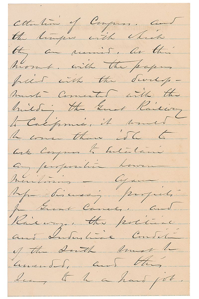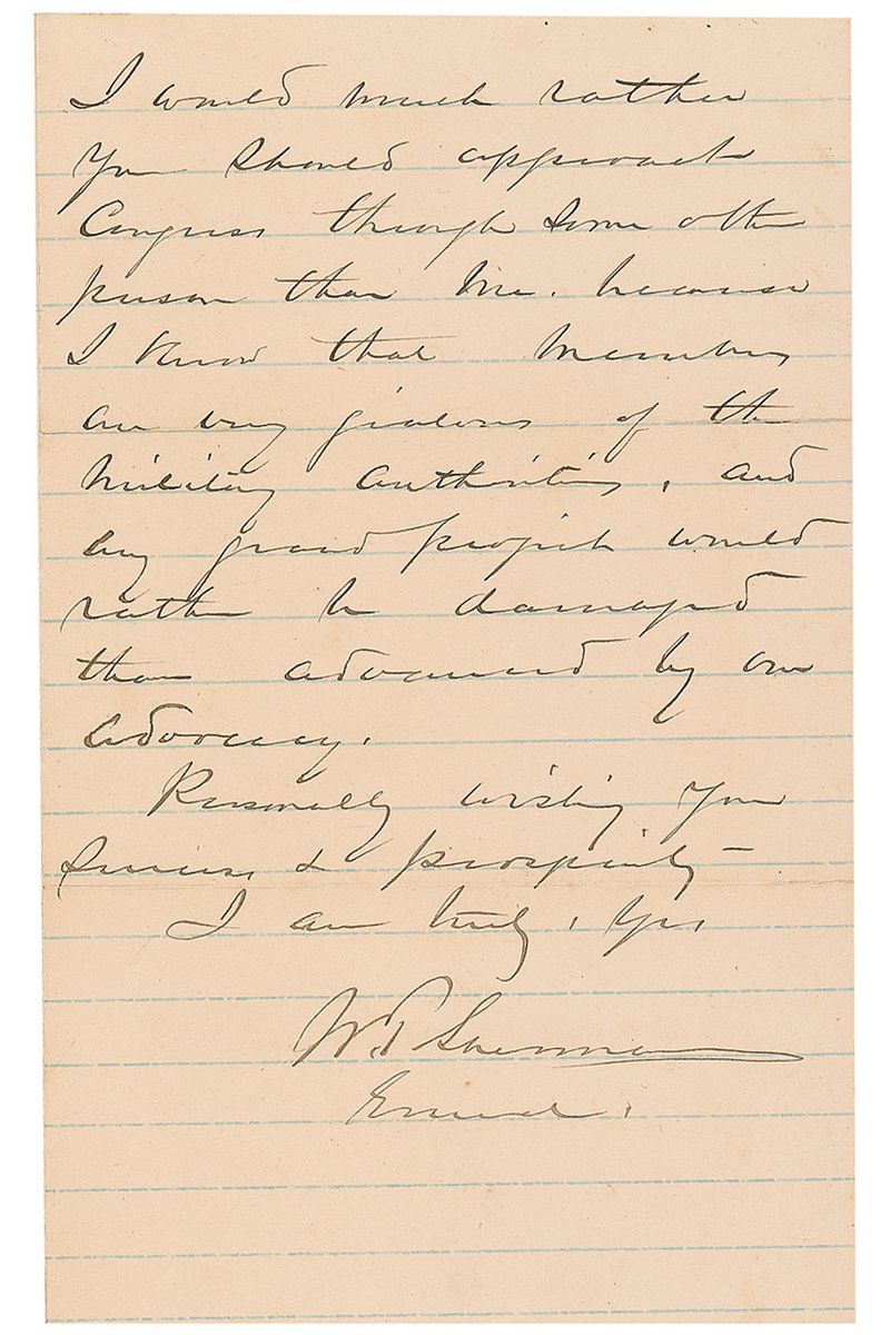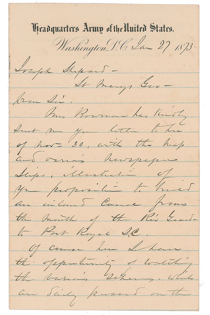 ALS signed “W. T. Sherman, General,” three pages on two lightly-lined adjoining sheets, 5 x 8, Headquarters Army of the United States letterhead, January 27, 1873. Letter to Joseph Shepard. In part: “Mrs. Bowman has kindly sent me your letter…with the map and various newspaper slips, illustration of your proposition to build an inland canal from the mouth of the Rio Grande to Port Royal, SC. Of course here I have the opportunity of watching the various schemes which are daily passed on the attention of Congress…the papers filled…connected with the building the Great Railway to California it would be worse than idle to ask Congress to entertain any proposition however meritorious. Again, before discussing proposals for Great Canals, and Railways the political and Industrial condition of the South must be answered and this seems to be a hard job. I would much rather you should approach Congress through some other person than me because I know that members are very jealous of the Military authorities, and any grand project would rather be damaged than advanced by our advocacy." A couple of partial separations along horizontal folds, otherwise fine condition.
