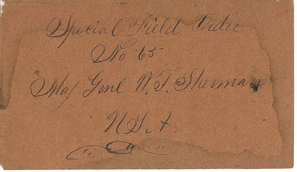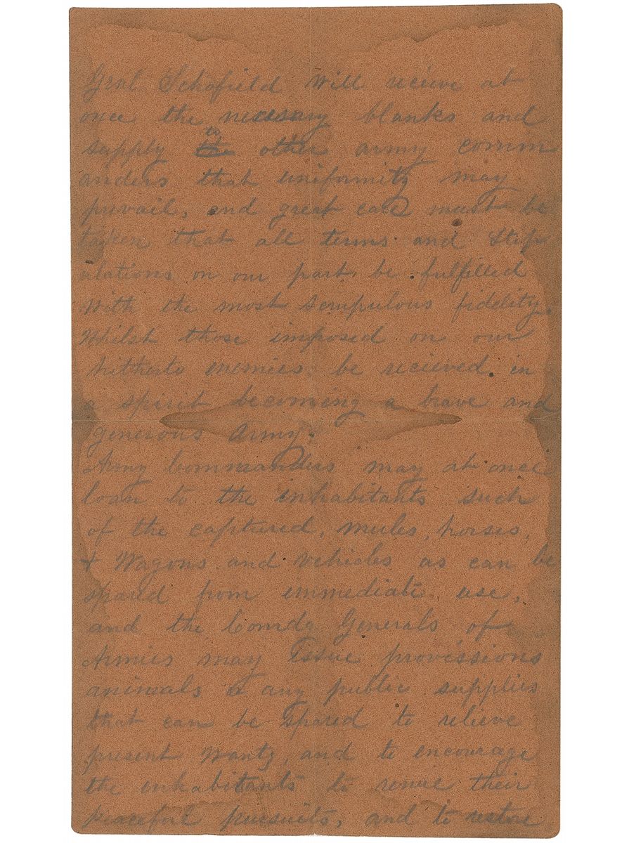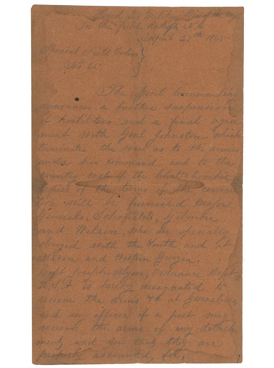 A rare official copy of General Sherman’s Field Order #65, in pencil, made by a Confederate adjutant general, three pages on two adjoining sheets, 4.5 x 7.5, April 27, 1865. Headed at the top “Head Qurs Military Div of the Miss, In the field, Raleigh, N.C.” In full: “The General commanding announces a further suspension of hostilities and a final agreement with Gen. Johnston which terminates the war as to the armies under his command and the country east of the Chattahoochee. Copies of the terms of convention will be furnished Major-Gens. Schofield, Gillmore, and Wilson, who are specially charged with the South and at Macon and Western Georgia.