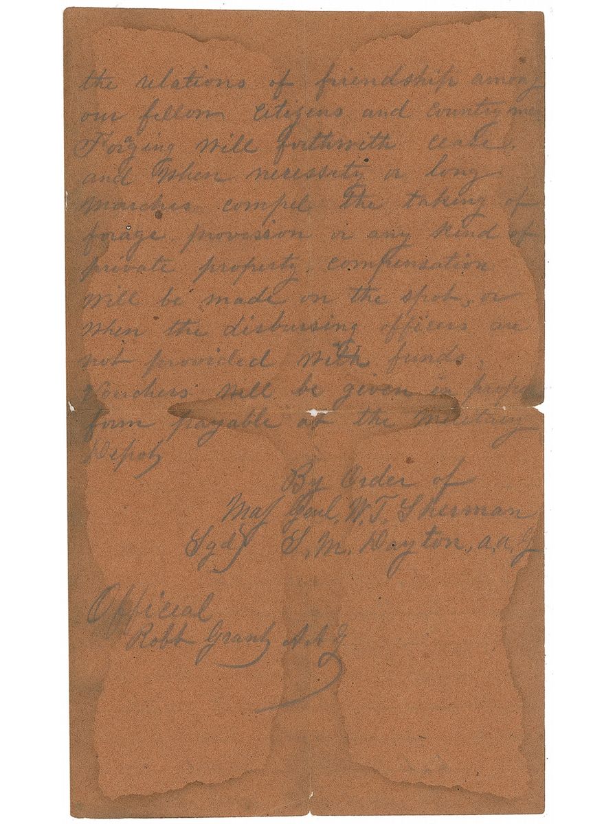 Foraging will forthwith cease, and when necessity or long marches compel the taking of forage, provisions or any kind of private property, compensation will be made on the spot, or when the disbursing officers are not provided with funds, vouchers will be given in proper form payable at the nearest military department. By order of Maj. Genl. W. T. Sherman, Sgd L. M. Dayton A.A.J.” Also noted at the conclusion, “Official, Robt. Grant AAG.”