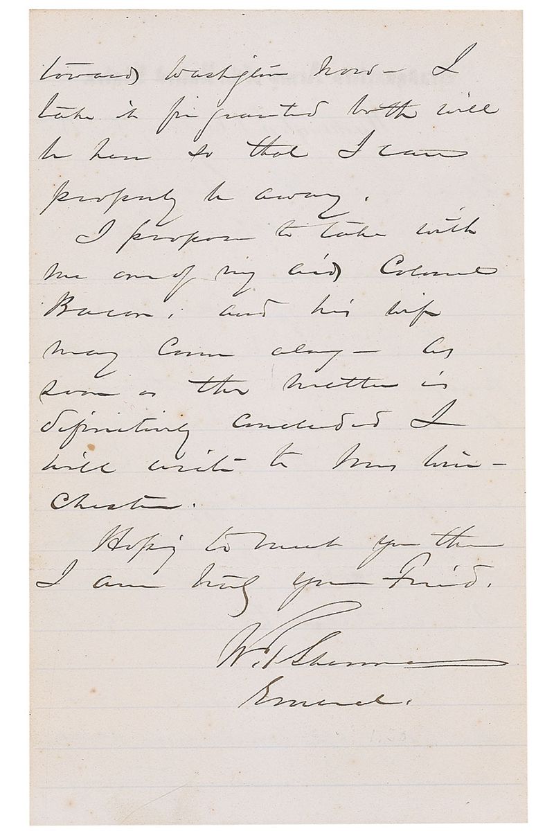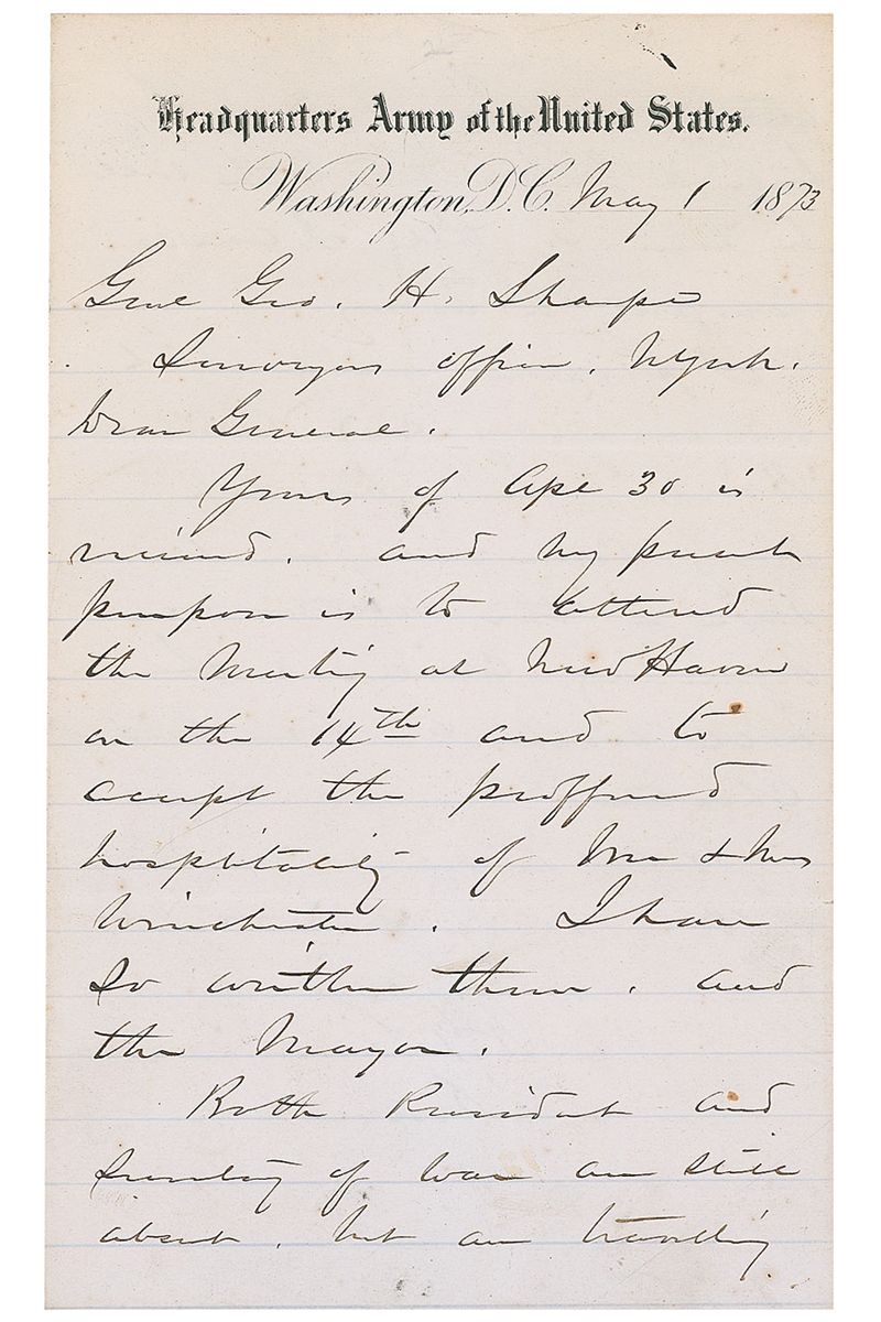 ALS signed “W. T. Sherman, General,” one page, lightly-lined both sides, 5 x 8, Headquarters Army of the United States letterhead, May 1, 1873. Letter to General George Sharpe. In part: “My present purpose is to attend the meeting at New Haven on the 14th and to accept the profound hospitality of Mr. & Mrs. Winchester…Both President and Secretary of War are still absent but are travelling toward Washington now. I take it for granted both will be here so that I can properly be away.” In fine condition, with intersecting folds, and a bit of scattered trivial foxing.