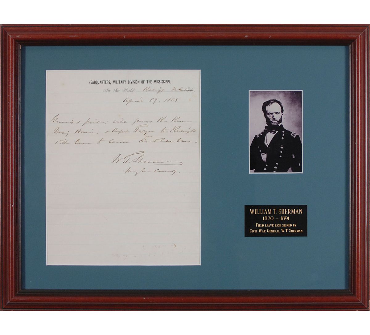 War-dated ADS, signed “W. T. Sherman, Maj Genl Cmdg,” one page, 7.25 x 9.25, April 19, 1865. Pass issued to two officers, including one Confederate. In full: “Guards & pickets will pass the Bearers Maj Haines & Capt Folger to Raleigh with leave to come and Return.” Matted and framed with a small portrait and a name plaque to an overall size of 17.75 x 13.75. In fine condition, with some scattered light creases and wrinkles and some light mirroring of text at bottom edge. A week after Lee’s surrender, Sherman received a message from General Johnston requesting a cessation of hostilities and the opening of peace negotiations. Two days later, Sherman offered Johnston military and civil terms of surrender to which he agreed. Unfortunately, U. S. Grant disapproved of the terms because it included civil provisions. He instructed him to give the 48-hour notice required by the terms of the truce, and afterward to proceed to attack or follow him. On April 26, Johnston, with Haines present, surrendered on the same terms as General Robert E. Lee.