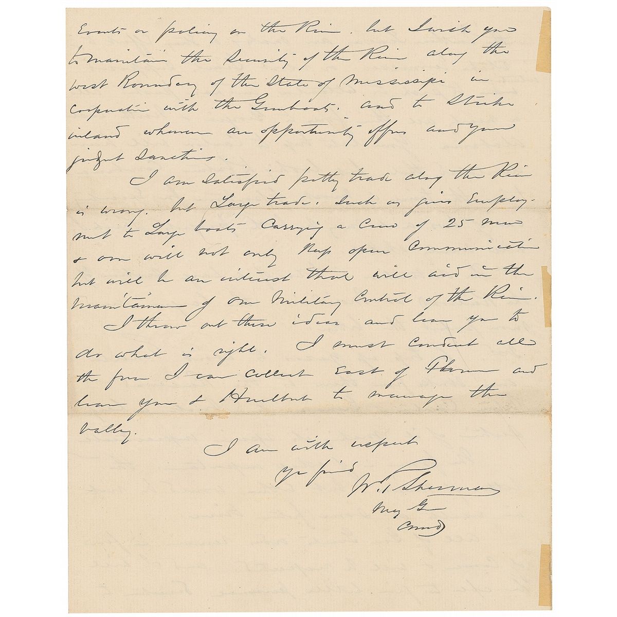 Civil War–dated ALS signed “W. T. Sherman, Maj. Gen. Comdg,” four pages, lightly-lined on two adjoining sheets, 7.75 x 9.75, Head Quarters Army of the Tennessee, Iuka, [Mississippi], October 24, 1863. Letter to General James B. McPherson. In full: “Young Dunn [Lieutenant William M. Dunn, Jr.] has just come out from Memphis with dispatches from Grant announcing all the Changes. These catch us as we had reason to anticipate short handed, but we must do our best. I shall leave you undisturbed. I regard the Yazoo as a kind of shield against the main River & therefore Vicksburg should be held with the tenacity of Life, also Haynes Bluff. But as the Enemy cannot bring artillery against you. Make the Earth works as small & perfect as possible. The high point north of Vicksburg is a Gibraltar—one similar south, and a Citadel at the Old Tower.—I don't see the use of a Force at Natchez. The Enemy has drawn from the place every man that is worth a cent to them as a soldier, and the buildings and property of the place is security for the good behavior of the People, that is, a threat to destroy Natchez and valuable plantations there will prevent any molestation of the River, which is the Grand desideratum.