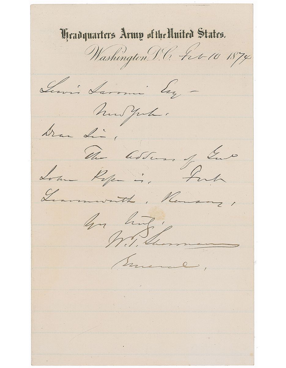 Famed Union general (1820–1891) best known for his devastating campaigns in the deep South, including the ‘March to the Sea,’ that led to the capture of Atlanta and Savannah and proved to be one of the turning points of the Civil War. ALS signed “W. T. Sherman, General,” one page, lightly-lined, 5 x 8, Headquarters Army of the United States letterhead, Washington, February 10, 1874. Letter to a gentleman. In full: “The address of Genl. John Pope is Fort Leavenworth, Kansas.” In fine condition, with central vertical and horizontal folds, and a light spot of soiling above the signature.