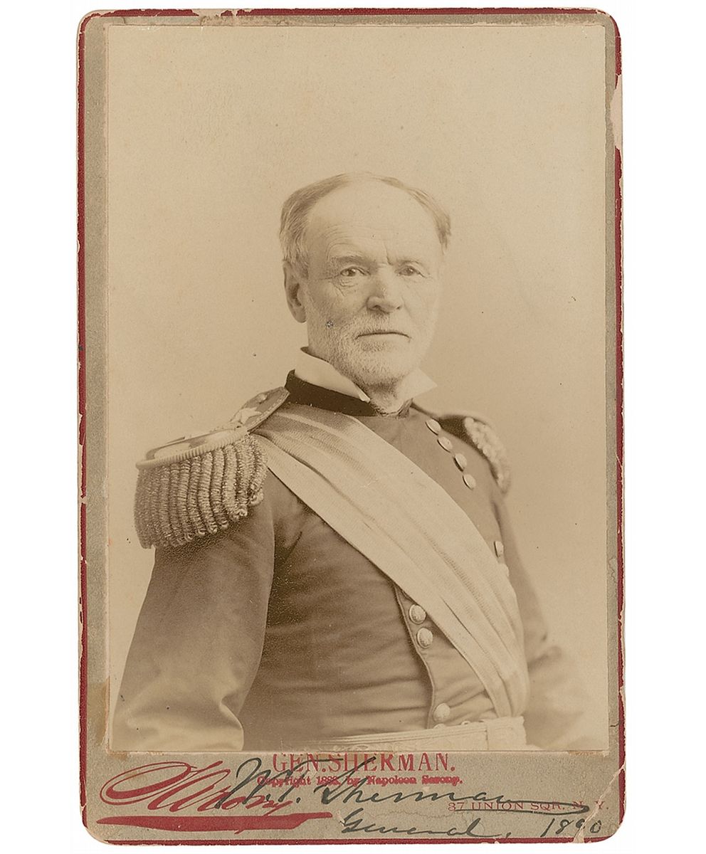 Distinguished original 4.25 x 6.5 cabinet photo of Sherman in full dress uniform by Sarony of New York, signed in the lower border in black ink, “W. T. Sherman, General 1890.” In very good condition, with crease to lower right corner, slightly affecting date, some chips and surface loss to edges, a few ripples, and some light toning to lower border.