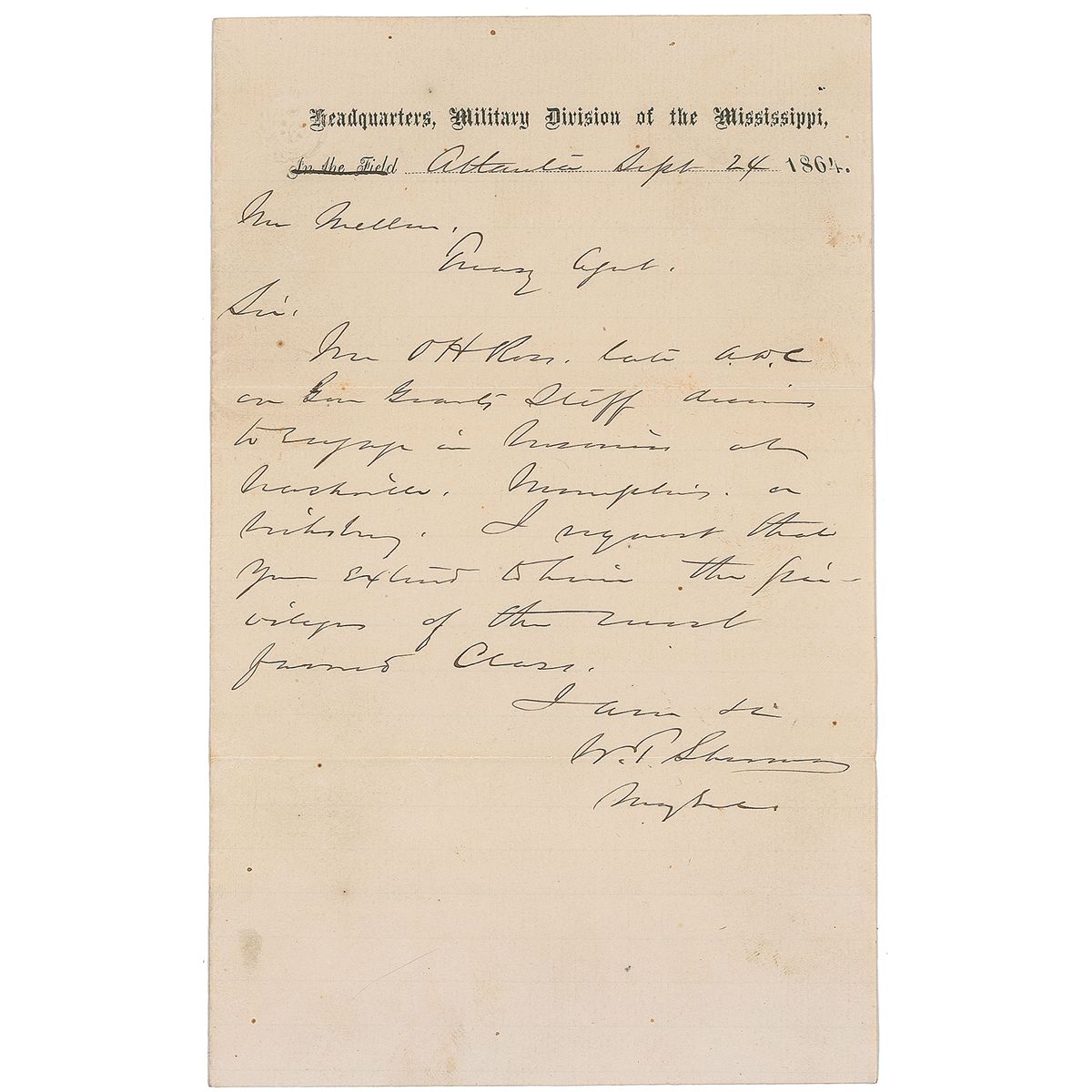 War-dated ALS signed “W. T. Sherman, Maj. Genl.,” one page, 5 x 8, Headquarters, Military Division of the Mississippi letterhead, September 24, 1864. Letter to treasury agent William P. Mellen. In full: “Mr OH Ross, late A.D.C. on Gen Grant’s Staff desires to engage in business at Nashville, Memphis, or Vicksburg. I request that you extend to him the privileges of the most favored Class.” On the reverse of the second integral page, Ross has written a note in pencil, which reads: “Your request to Mr. Mellen is in general terms. I want a request to him to give me a military supply store at Vicksburg. Please telegraph him to that effect, and it will be sufficient." A horizontal fold passing through signature and some scattered light soiling, otherwise fine condition. Accompanied by the original transmittal envelope.