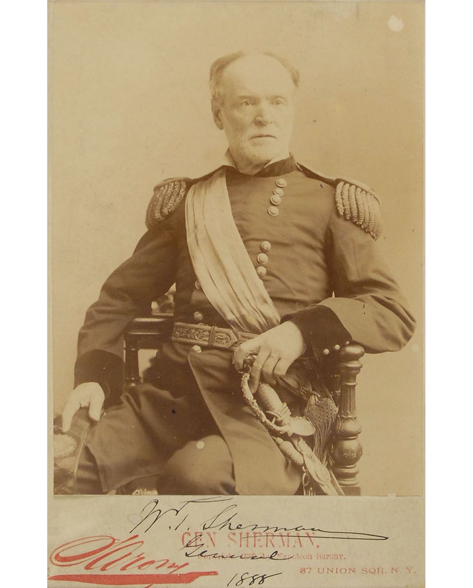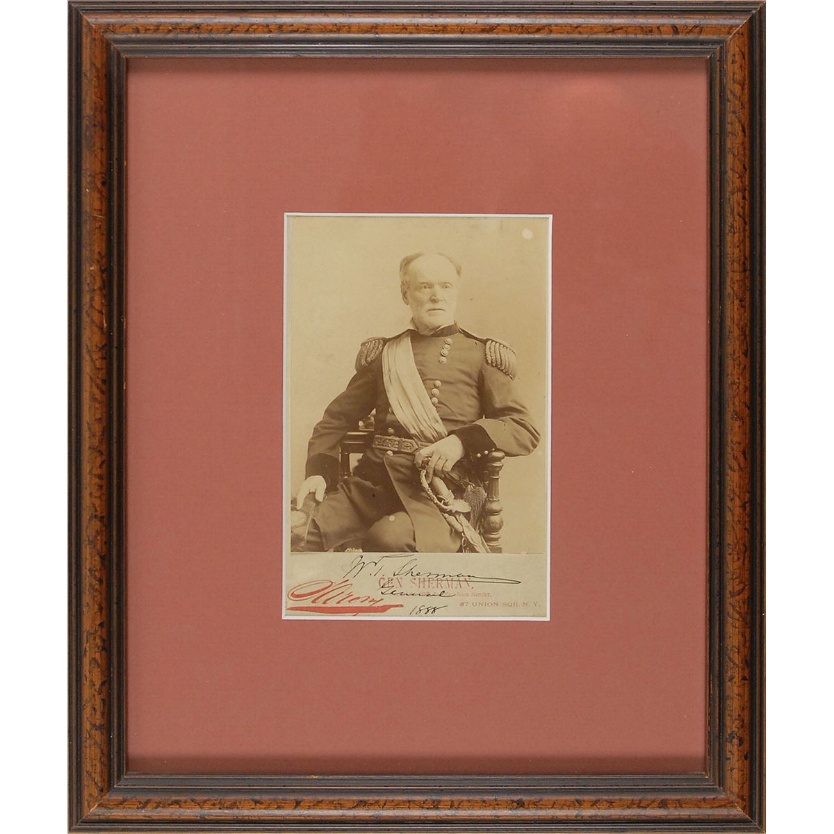 Exquisite 4.25 x 6.5 cabinet photo of Sherman in full military dress with his sword by his side, signed on the mount in black ink, “W. T. Sherman, General, 1888.” Published by Sarony of New York. Matted and framed to an overall size of 11 x 13. In fine condition, with a few surface marks and light creases.