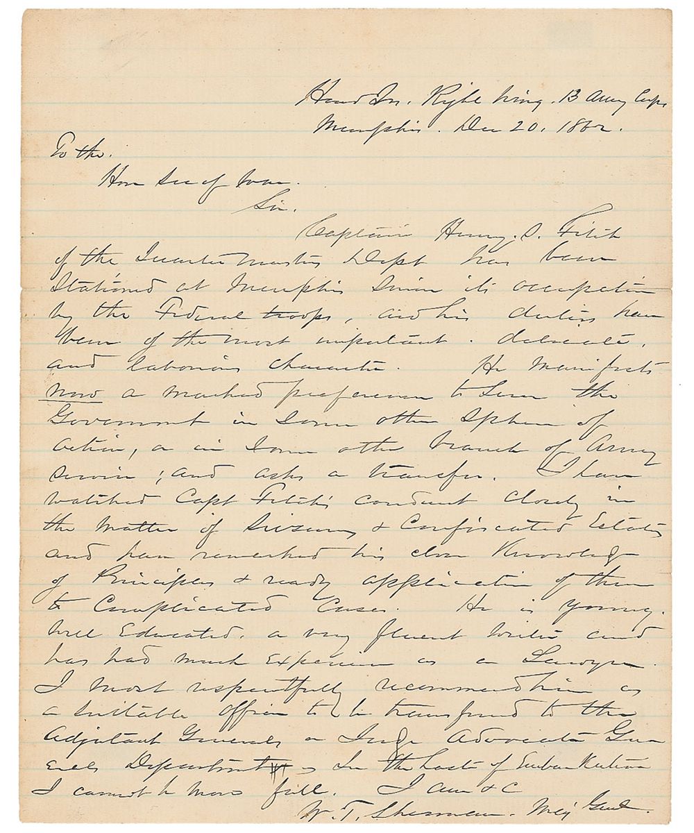 Civil War–dated ALS signed “W. T. Sherman, Maj. Genl,” one page, lightly-lined, 8 x 10, Memphis, December 20, 1862. Letter to Secretary of War Edwin M. Stanton. In full: “Captain Henry S. Fitch of the Quarter Masters Dept has been stationed at Memphis since its occupation by the Federal troops, and his duties have been of the most important delicate and laborious character. He manifests now a marked preference to serve the Government in some other sphere of action, or in some other branch of Army service; and asks a transfer. I have watched Capt Fitch’s conduct closely in the matter of Seizing & Confiscating Estates and have remarked his clear knowledge of Principles & ready application of them to Complicated Cases. He is young, well educated, a very fluent writer and has had much experience as a Lawyer. I most respectfully recommend him as a suitable officer to be transferred to the Adjutant Generals or Judge Advocate Generals Department. In the haste of Embarkation I cannot be more frill.” In fine condition. Sherman left Memphis on the day he penned this letter, taking 32,000 men down the Mississippi to strike at Vicksburg from the water. When they reached the area on December 26, Sherman’s forces were repelled by John C. Pemberton at the Battle of Chickasaw Bayou—a Confederate victory at the opening engagement of the Vicksburg Campaign. A choice letter from this pivotal moment in the war, ultimately concluding with Grant’s capture of Vicksburg on July 4, 1863.
