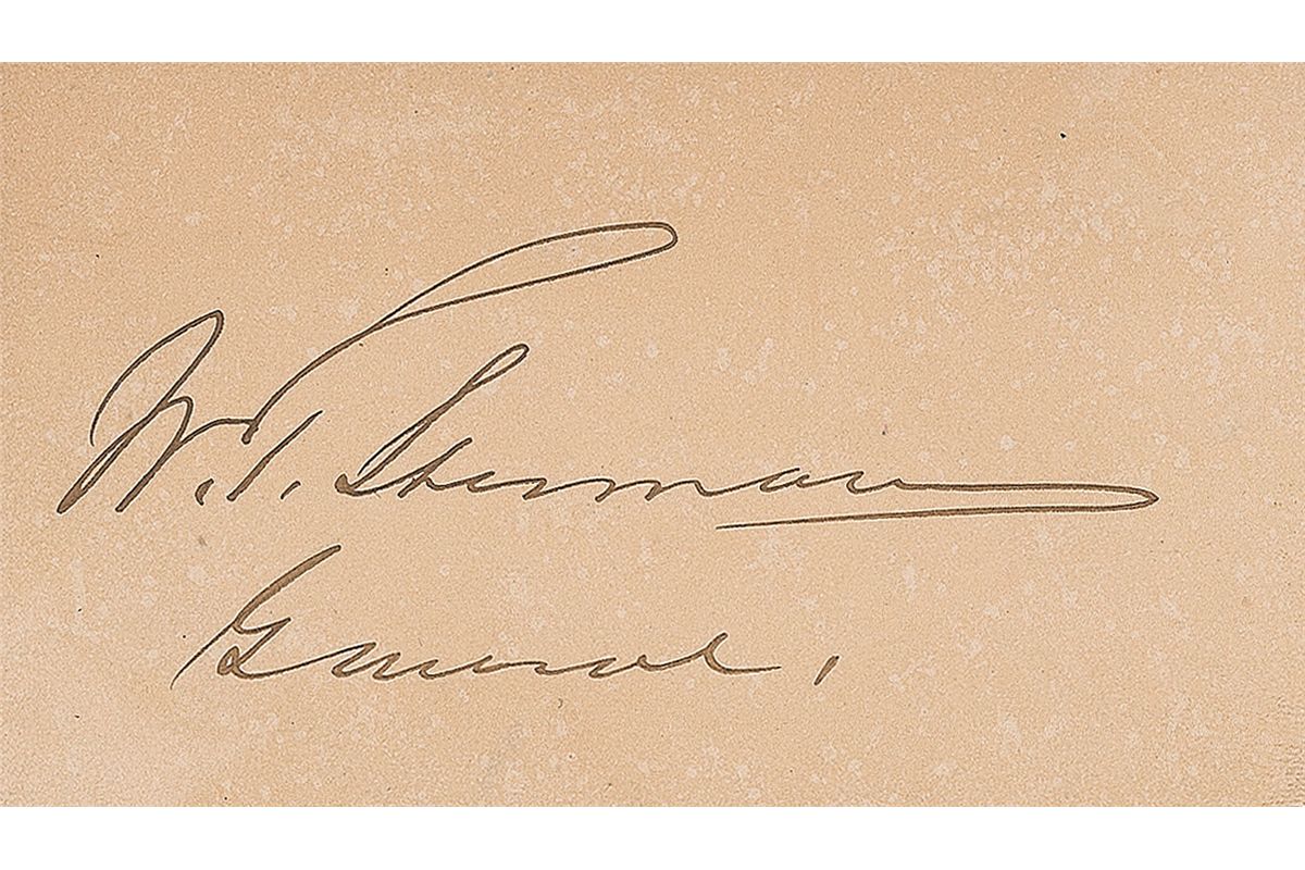 Personal calling card bearing Sherman’s name, rank, and address, 4 x 2.25, signed on the reverse in black ink, “W. T. Sherman, General.” In fine condition. Accompanied by a modern unsigned photo.