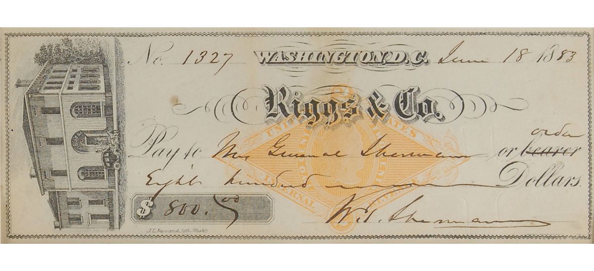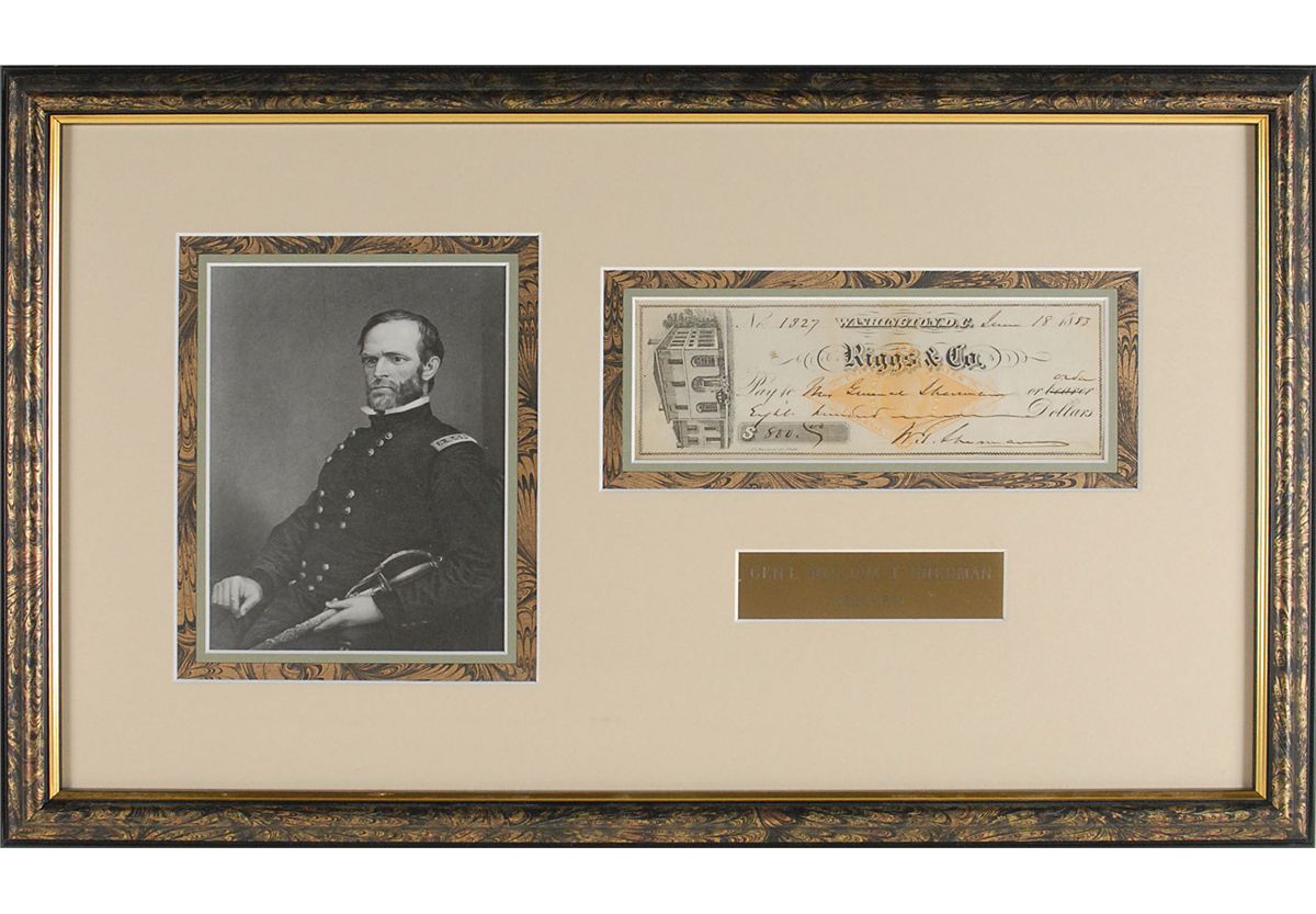 Bank check, 7.25 x 2.5, filled out and signed by Sherman, “W. T. Sherman,” payable to Mrs. General Sherman for $800.00, June 18, 1883. Triple-matted and framed with a portrait of Sherman and a small plaque to an overall size of 20.75 x 13. In fine condition, with a bit of scattered light toning and a crisp cancellation cut through portion of last name of signature.