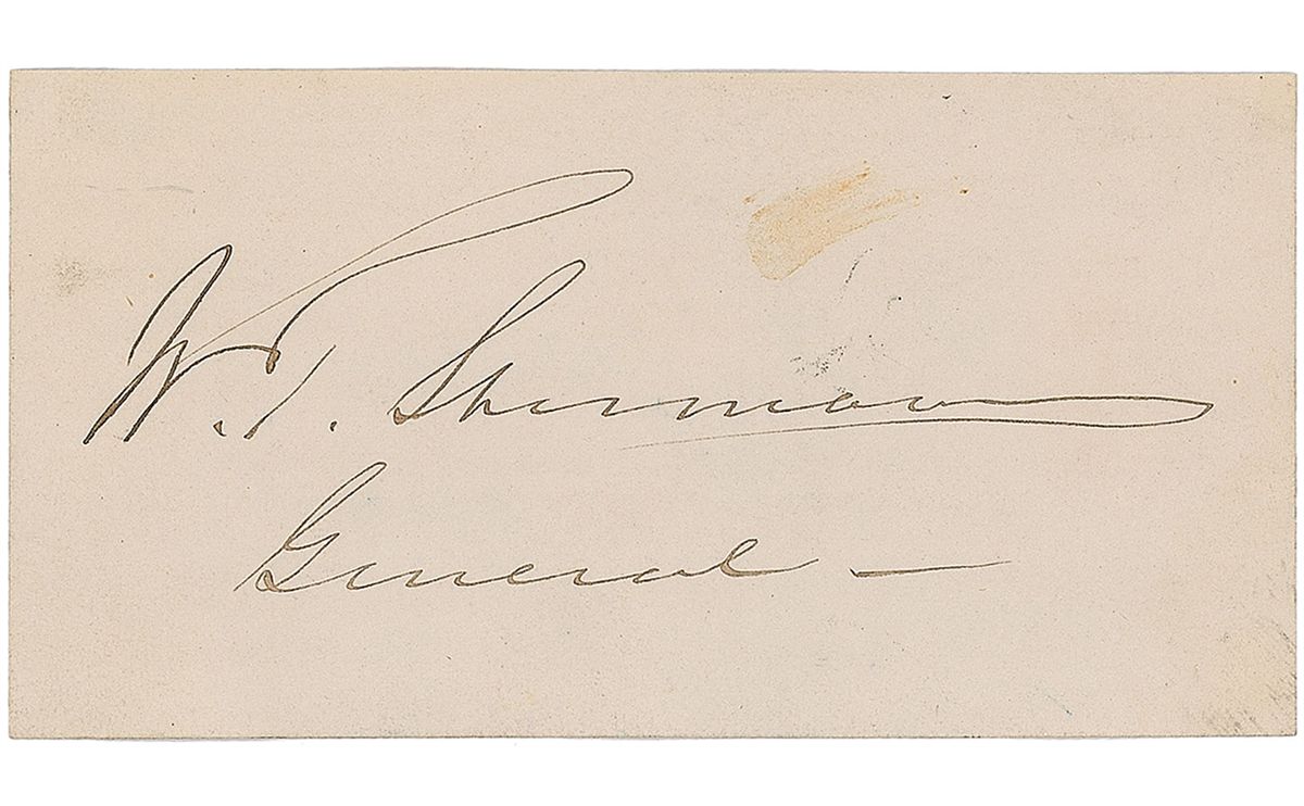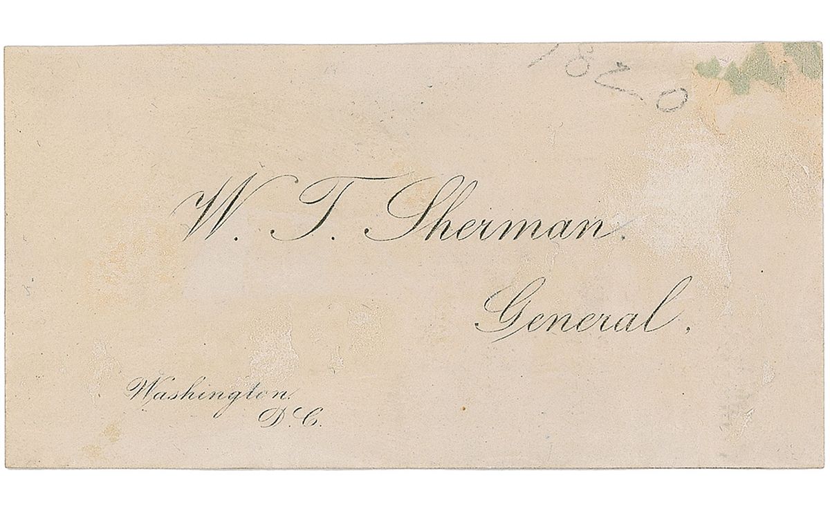 Sherman’s personal calling card printed with his name, rank, and Washington address, 3.75 x 2, signed on the reverse in ink, “W. T. Sherman, General,” Mounting remnants to the printed side of the card, otherwise fine condition.