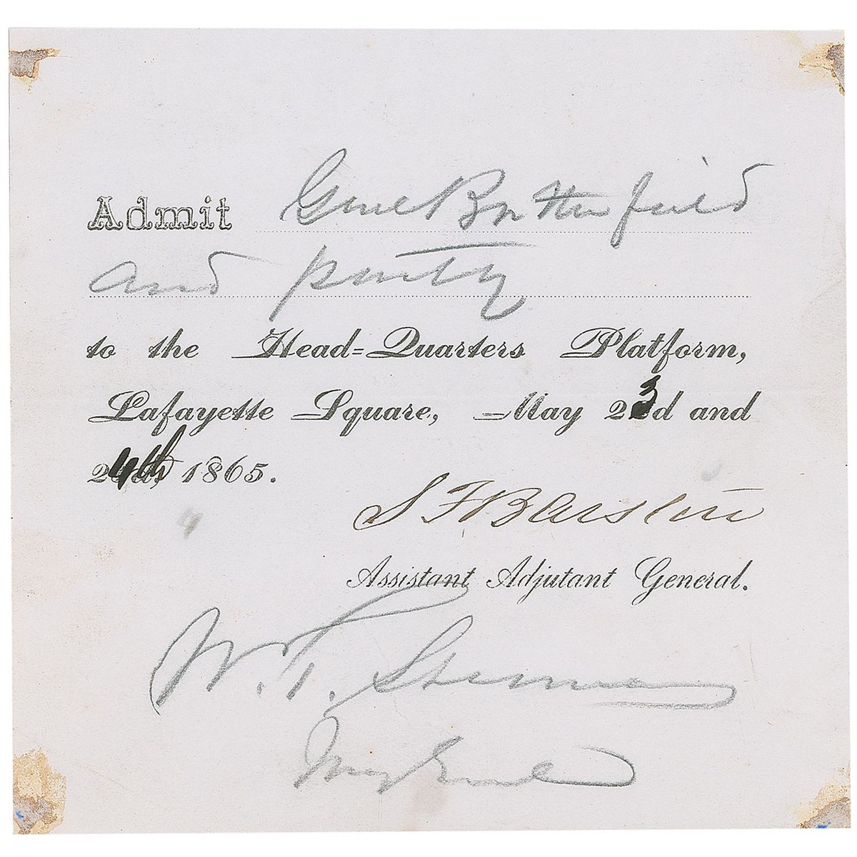 Partly-printed pass for the Grand Review of the Armies, 5 x 4.75, filled out and signed in pencil by Sherman, “W. T. Sherman, Maj. Gen’l.” In full: “Admit Gen’l Butterfield and party to the Head-Quarters Platform, Lafayette Square, May 23d and 24th, 1865.” A central horizontal fold, overall wrinkling, and toned tape remnants to corners, otherwise fine condition. In celebration of the Civil War’s conclusion just two weeks earlier, the ‘Grand Review’ was the triumphant parade of troops down Pennsylvania Avenue to the White House reviewing stands at Lafayette Square. General Butterfield was a recipient of the Medal of Honor and credited as the composer of ‘Taps.’ An excellent association piece from the immediate aftermath of the war.