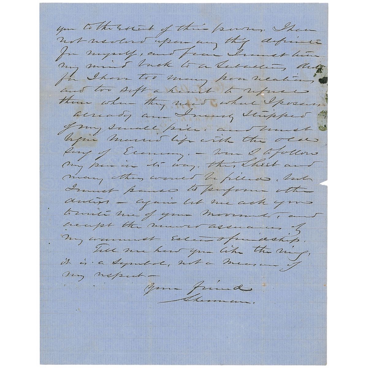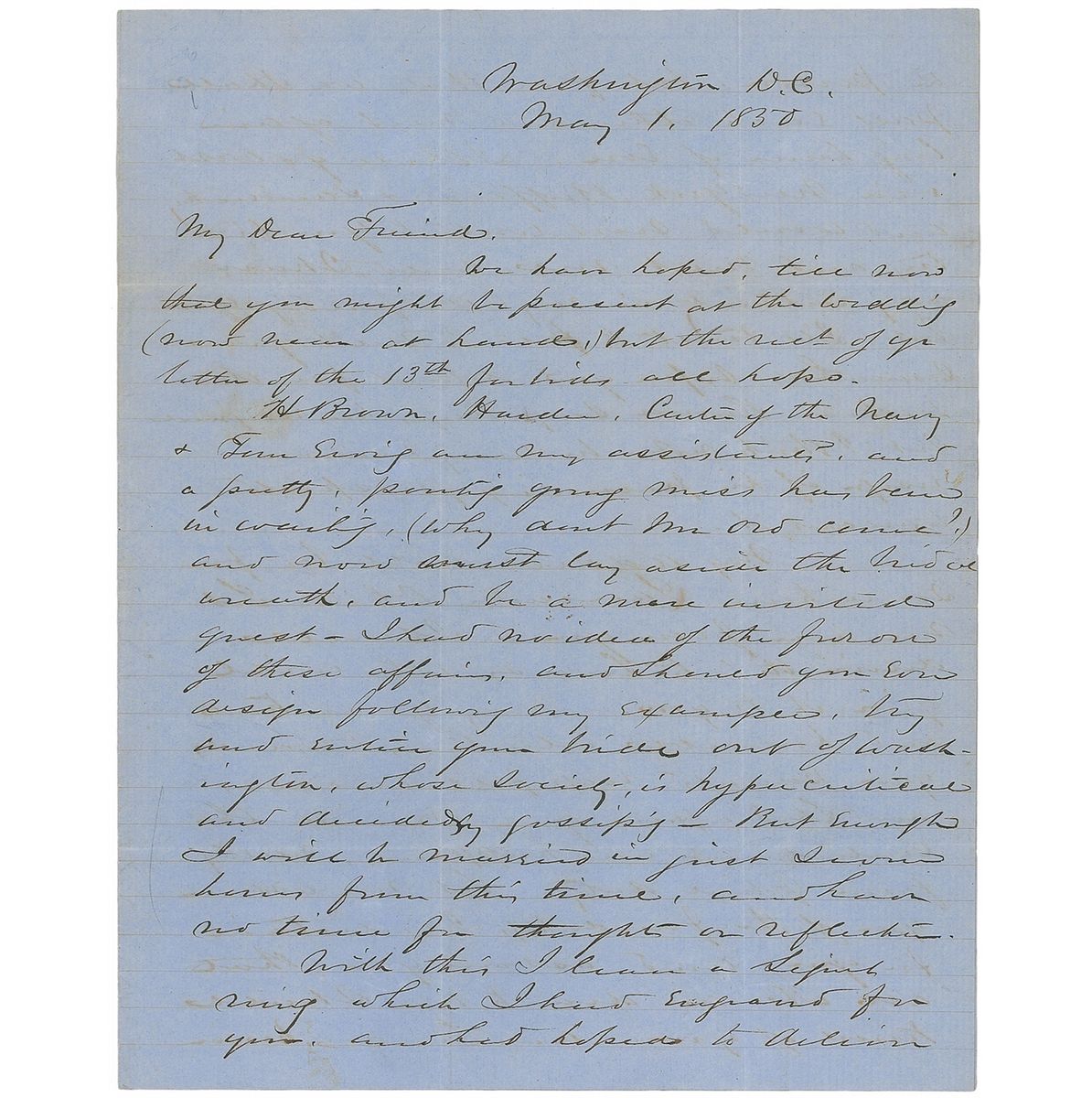 ALS signed “Sherman,” three pages on two adjoining sheets, 8 x 9.75, May 1, 1850. Letter to Lieutenant Edward O. C. Ord. In part: “We have hoped till now that you might be present at the wedding (now near at hand) but the rect of yr letter of the 13th forbids all hope. H Brown, Harder, Carter of the Navy & Tom Ewing are my assistants, and a pretty, perky young miss has been in waiting…I will be married in just seven hours from this time, and had no time for thought or reflection…With this I leave a Signet ring which I had engraved for you and had hoped to achieve in person, but from that we shall pass each other and meet again long hence if ever. I shall go west via New York, Buffalo, & Sandusky and would now write to you to try and meet me, could I have any certainty in my letter finding you, but I’ll trust to fate to meet you somewhere before you depart for the west…Let me assure you of the friendship I entertain for you and assure you that all who are dear to me shall know of you and shall honor you to the extent of their power. I have not resolved upon any thing definite for myself…I have too many poor relations and too soft a heart to refuse them when they need what I possess already am I nearly stripped of my small pile, and must begin married life with the old song of Economy…again let me ask you to write me of your movements and accept the renewed assurances of my warmest esteem & friendship. Tell me how you like the ring, it is a symbol, not a measure of my respect.” Reverse of second integral page is addressed by Sherman to Ord. Intersecting folds with a couple small edge separations, light toning, and show-through from writing to opposing sides, otherwise fine condition. After his father passed away when he was nine, Sherman went to live with a family friend, Thomas Ewing. On the day he wrote this letter, he married Ewing's daughter, Eleanor Boyle Ewing, in a Washington ceremony attended by President Zachary Taylor and other political luminaries. The recipient, Edward Ord, was Sherman's roommate at West Point and was later instrumental in forcing the surrender of Confederate General Robert E. Lee.