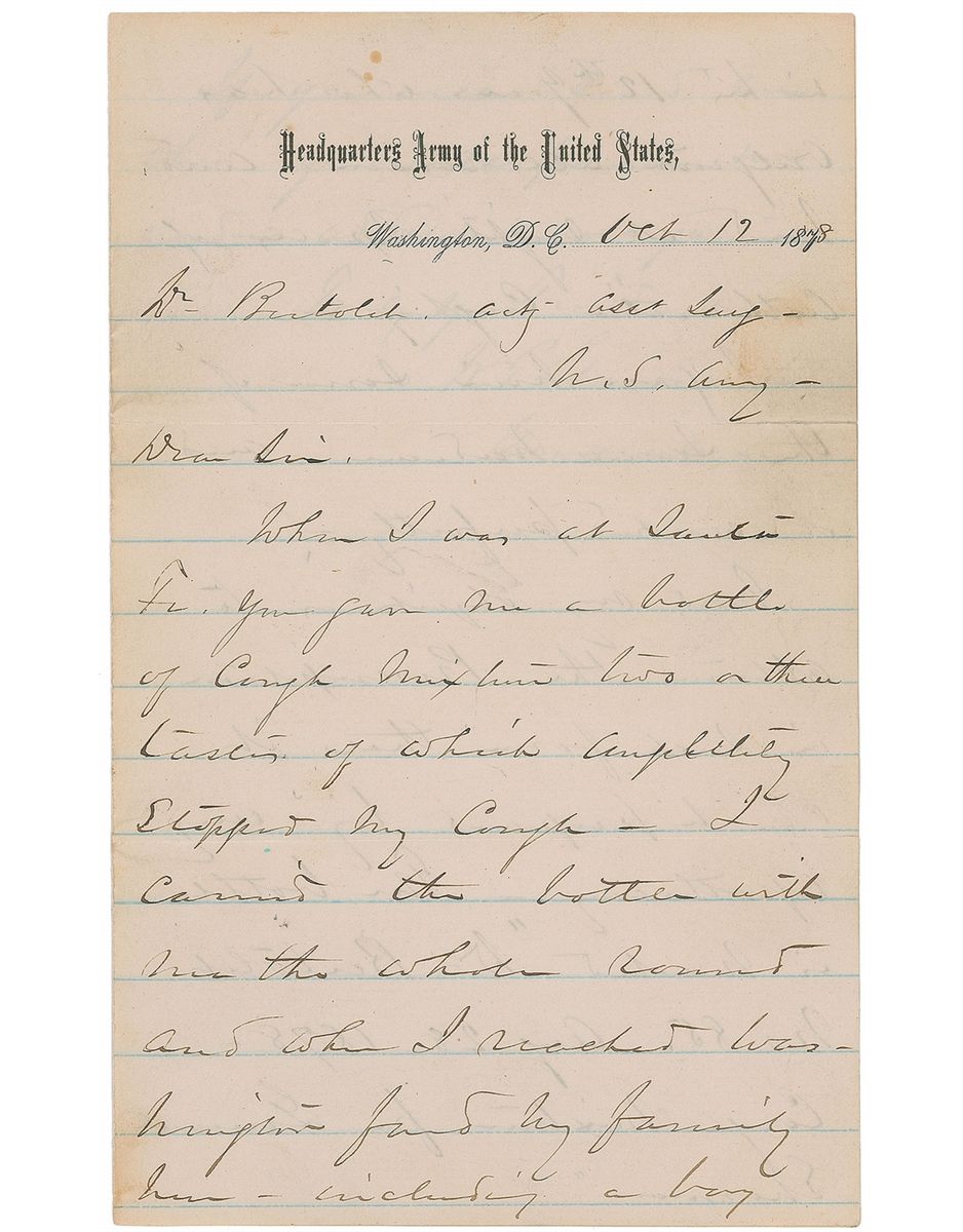 ALS signed “W. T. Sherman, General,” three pages on two adjoining lightly-lined sheets, 5 x 8, Headquarters, Army of the United States letterhead, October 12, 1878. Letter to Dr. Bertolet, the acting assistant surgeon of the US Army. In full: “When I was in Santa Fe you gave me a bottle of Cough Mixture two or three tastes of which completely stopped my cough. I carried the bottle with me the whole round and when I reached Washington found my family here–including a boy in his 12th year who…had at night spells of Asthmatic Coughing. I gave him some of the…Medicine and it worked perfectly. Now my object is to obtain the Prescription in such form that it can be prepared by any apothecary. The bottle is marked ‘Dr. Bertolet No. 85, Aug. 28, 1878-Cough Mixture for General Sherman.’ If you will send me this, you will place me under additional obligation.” Small edge separations to horizontal mailing folds, and light toning and soiling, otherwise fine condition. Accompanied by the original mailing envelope addressed in Sherman’s hand, and two unsigned carte-de-visite portraits, one of Sherman and his generals and one of Bertolet.