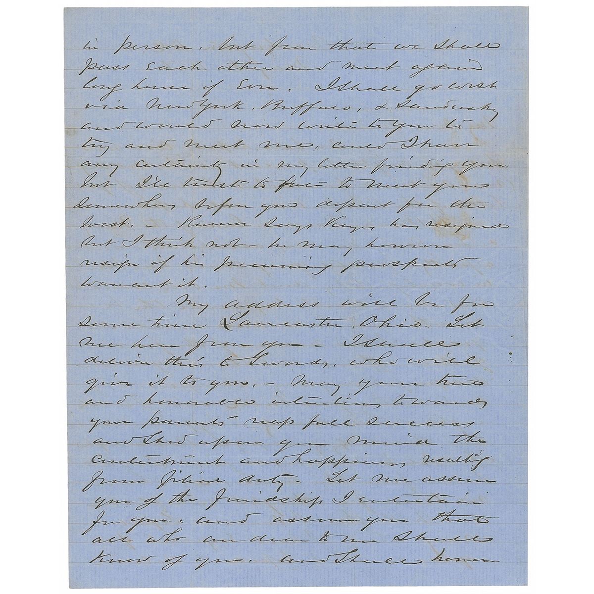 ALS signed “Sherman,” three pages on two adjoining sheets, 8 x 9.75, May 1, 1850. Letter to Lieutenant Edward O. C. Ord. In part: “We have hoped till now that you might be present at the wedding (now near at hand) but the rect of yr letter of the 13th forbids all hope. H Brown, Harder, Carter of the Navy & Tom Ewing are my assistants, and a pretty, perky young miss has been in waiting…I will be married in just seven hours from this time, and had no time for thought or reflection…With this I leave a Signet ring which I had engraved for you and had hoped to achieve in person, but from that we shall pass each other and meet again long hence if ever. I shall go west via New York, Buffalo, & Sandusky and would now write to you to try and meet me, could I have any certainty in my letter finding you, but I’ll trust to fate to meet you somewhere before you depart for the west…Let me assure you of the friendship I entertain for you and assure you that all who are dear to me shall know of you and shall honor you to the extent of their power. I have not resolved upon any thing definite for myself…I have too many poor relations and too soft a heart to refuse them when they need what I possess already am I nearly stripped of my small pile, and must begin married life with the old song of Economy…again let me ask you to write me of your movements and accept the renewed assurances of my warmest esteem & friendship. Tell me how you like the ring, it is a symbol, not a measure of my respect.” Reverse of second integral page is addressed by Sherman to Ord. Intersecting folds with a couple small edge separations, light toning, and show-through from writing to opposing sides, otherwise fine condition. After his father passed away when he was nine, Sherman went to live with a family friend, Thomas Ewing. On the day he wrote this letter, he married Ewing's daughter, Eleanor Boyle Ewing, in a Washington ceremony attended by President Zachary Taylor and other political luminaries. The recipient, Edward Ord, was Sherman's roommate at West Point and was later instrumental in forcing the surrender of Confederate General Robert E. Lee.