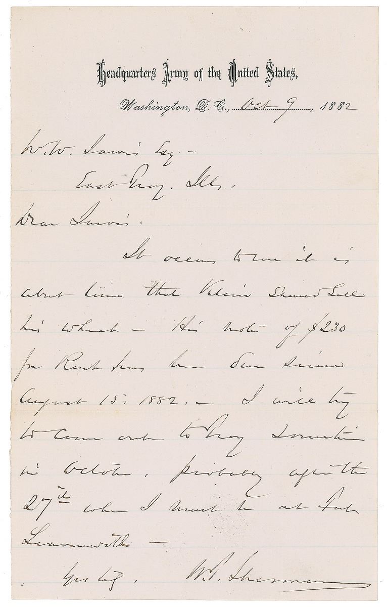ALS signed “W. T. Sherman,” one page, lightly-lined, 5 x 8, Headquarters Army of the United States letterhead, October 9, 1882. Letter to W. W. Jarvis, in full: “It occurs to me it is about time that Klein should sell his wheat. His note of $230 for Rent has been due since August 15, 1882. I will try to come out to Troy sometime in October, probably after the 27th when I must be at Fort Leavenworth.” In fine condition.