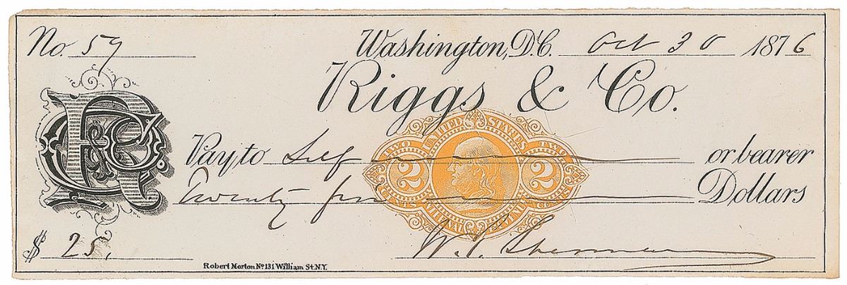 Riggs & Co. bank check, 8 x 2.75, filled out and signed by Sherman, “W. T. Sherman,” payable to self for $25, October 30, 1876. In fine condition.