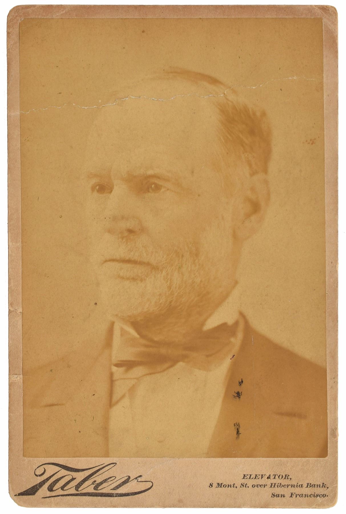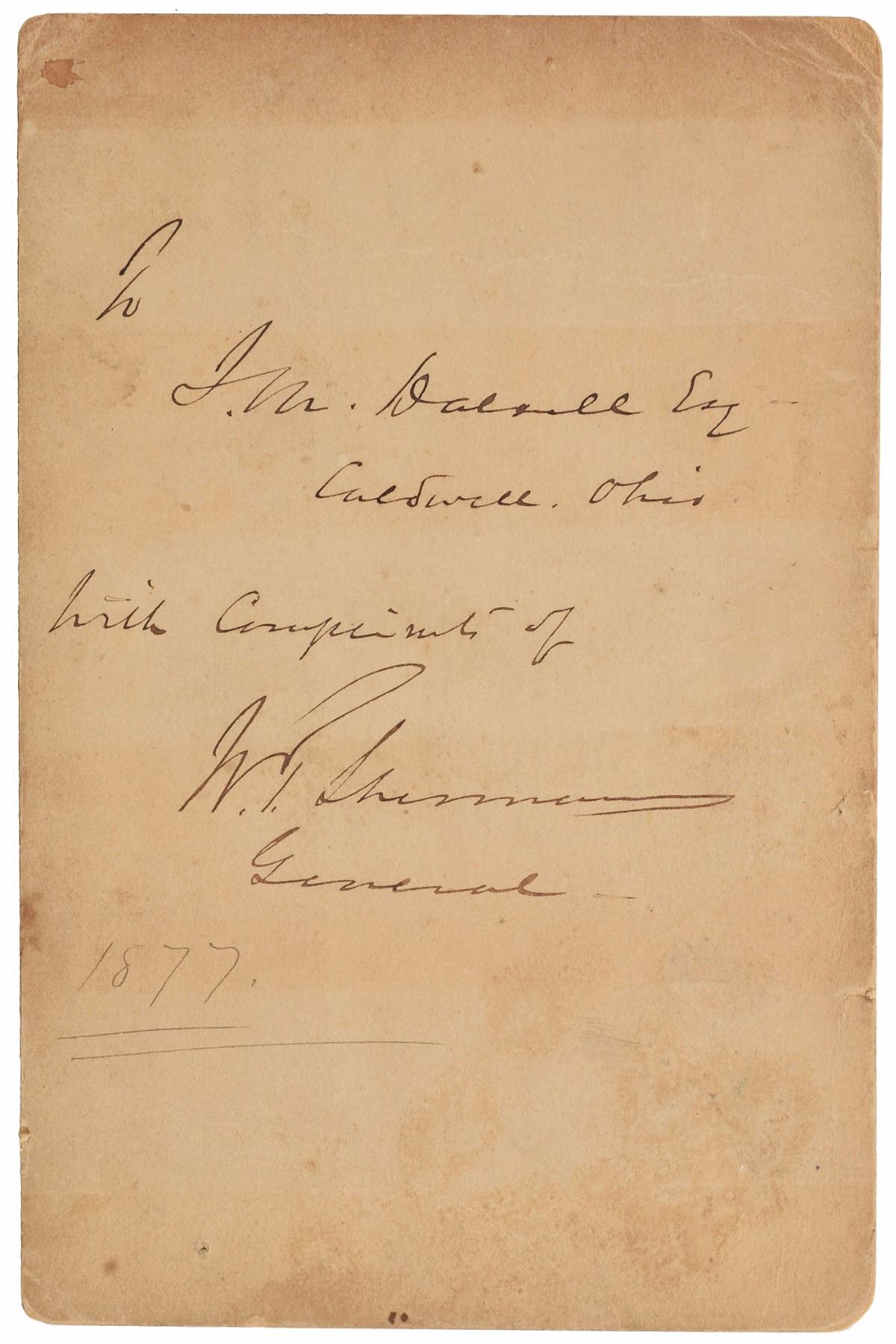 Uncommon 4.26 x 6.5 cabinet portrait of Sherman, signed and inscribed on the reverse in black ink, "To J. M. Dalrell Esq, Caldwell, Ohio, with compliments of, W. T. Sherman, General.” Published by Taber of San Francisco. Signature is dated to 1877 in an unknown hand. In very good condition, with a crease passing through Sherman's forehead, fading to the image, and irregular toning and soiling to the reverse. An attractive and uncommonly seen close-up cabinet photo of the revered military icon.