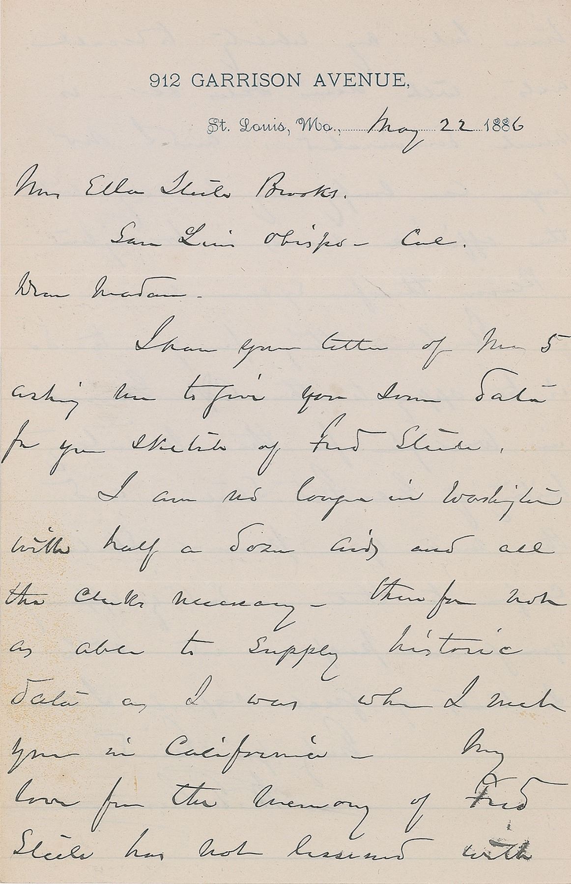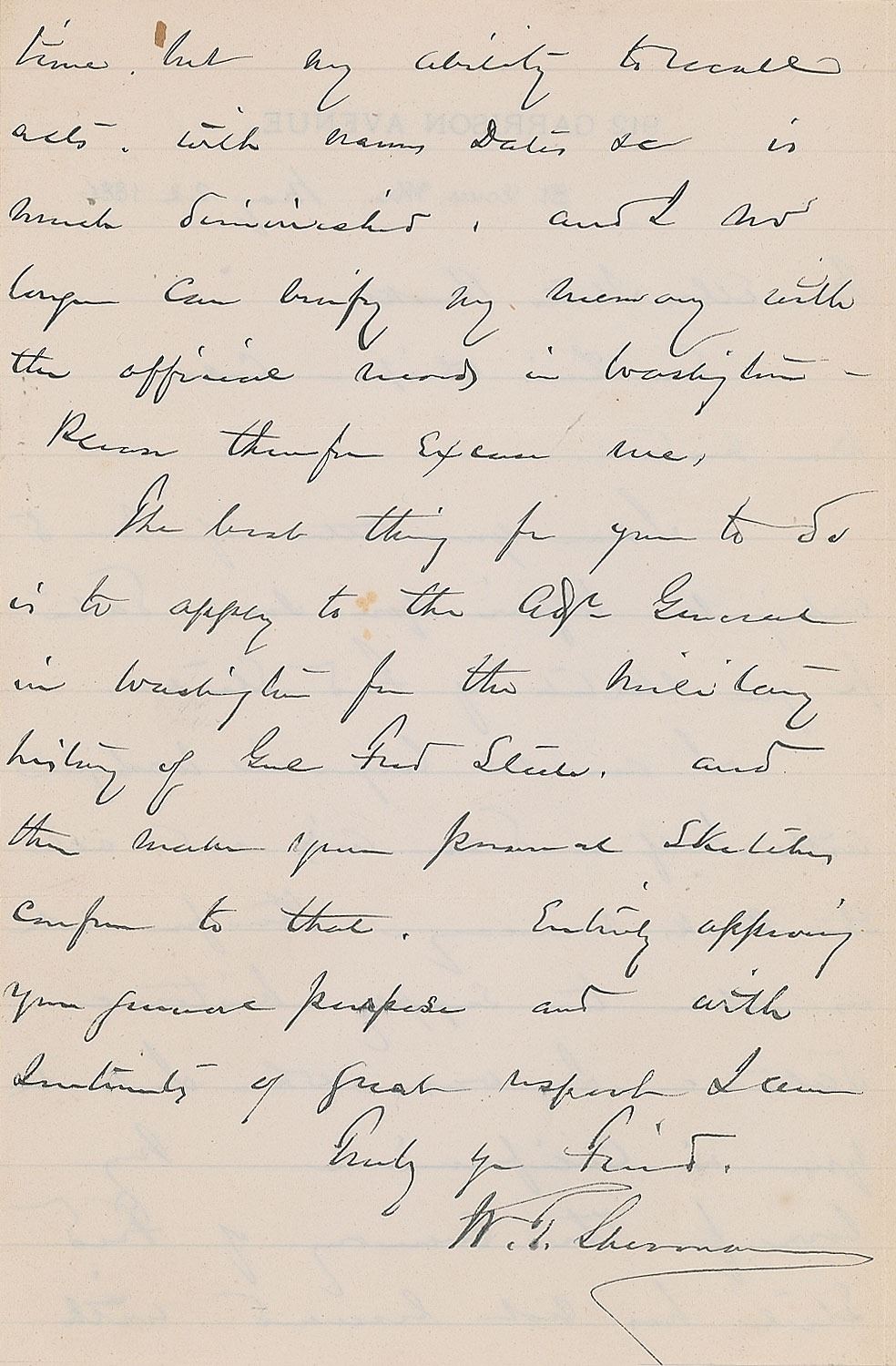 ALS signed “W. T. Sherman,” one page both sides, 5.5 x 8.25, personal letterhead, May 22, 1886. Letter to Ella Steele Brooks in San Luis Obispo, California, about her uncle, Union General Frederick Steele, who served under Sherman. In part: "I am no longer in Washington with half a dozen aids…therefore not as able to supply historic data as I was when I met you in California. My love for the memory of Fred Steele has not lessened with time, but my ability to recall acts, with names, dates &c is much diminished, and I no longer can verify my memory with the official record in Washington…The best thing for you to do is to apply to the Adj. Genl. in Washington for the military history of Genl. Fred Steele, and then make your personal sketches conform to that." In fine condition.