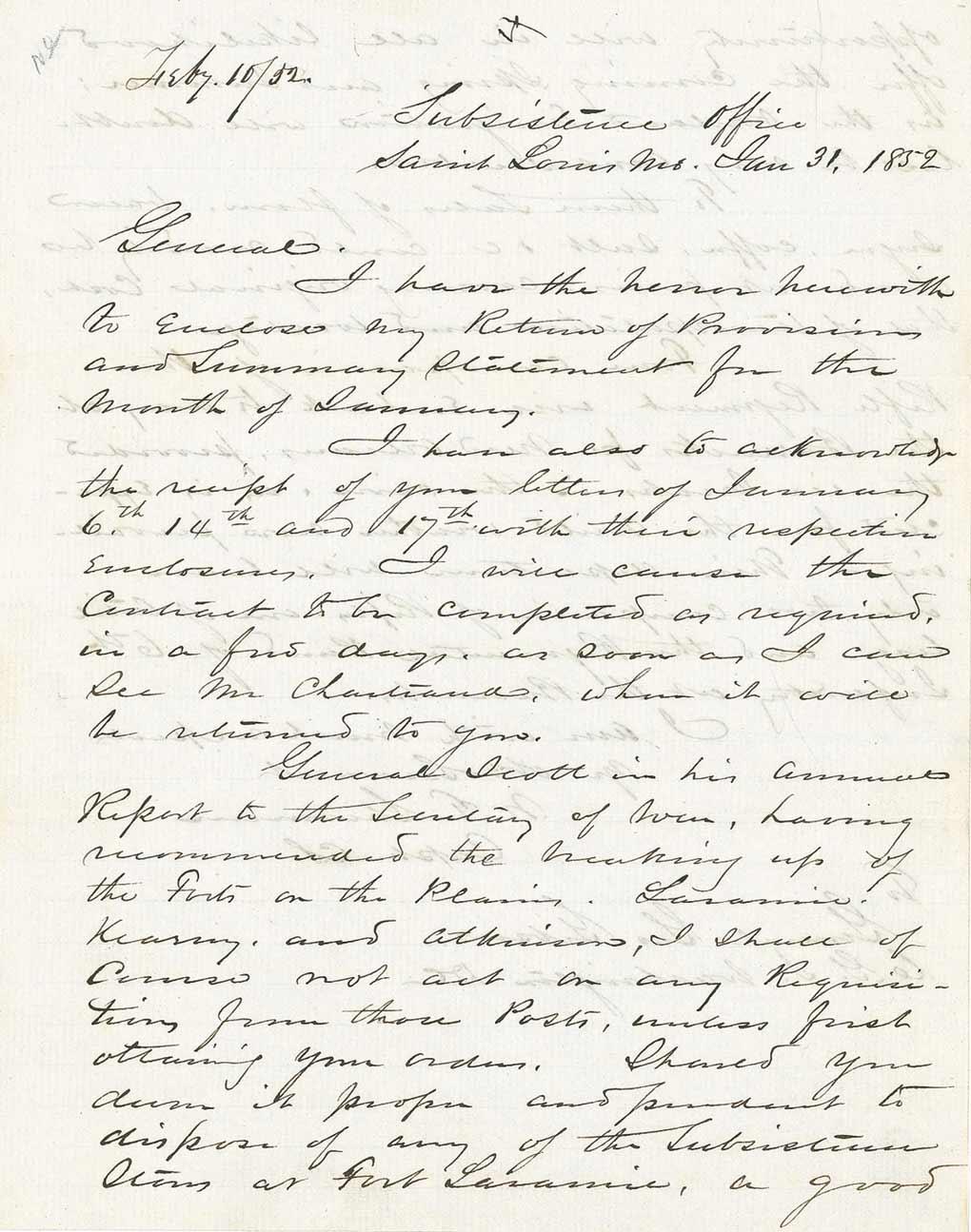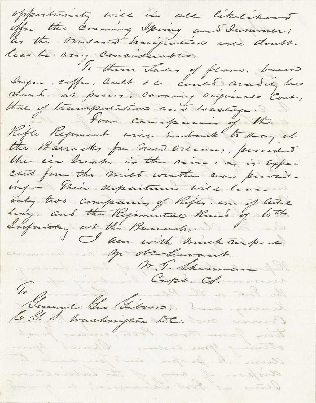 ALS signed “W. T. Sherman, Capt. C.S.,” one page both sides, 7.75 x 10, January 31, 1852. Letter to General George Gibson. In part: “General Scott in his Annual Report to the Secretary of War, having recommended the breaking up of the Forts on the Plains, Laramie, Kearny, and Atkinson, I shall of course not act on any Requisitions from those Posts, unless first obtaining your orders. Should you deem it proper and prudent to dispose of any of the Subsistence items at Fort Laramie, a good opportunity will in all likelihood offer the coming Spring and Summer; as the overland Emigration will doubtless be very considerable…Sales of flour, bacon, sugar, coffee, salt &c could readily be made at prices, covering cost, that of transportation and wastage. Four companies of the Rifle Regiment will Embark today at the Barracks for New Orleans, provided the ice breaks in the river…Their departure will leave only two companies of Rifles, one of Artillery, and the Regimental Band of 6th Infantry at the Barracks.” In fine condition, with a light horizontal mailing fold through signature, and slight show-through from text on opposing sides.