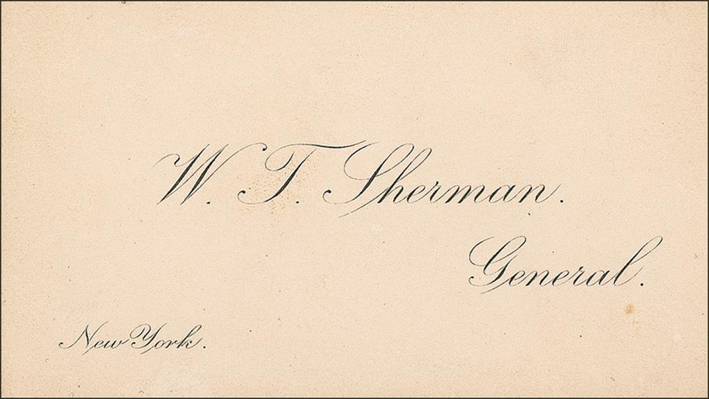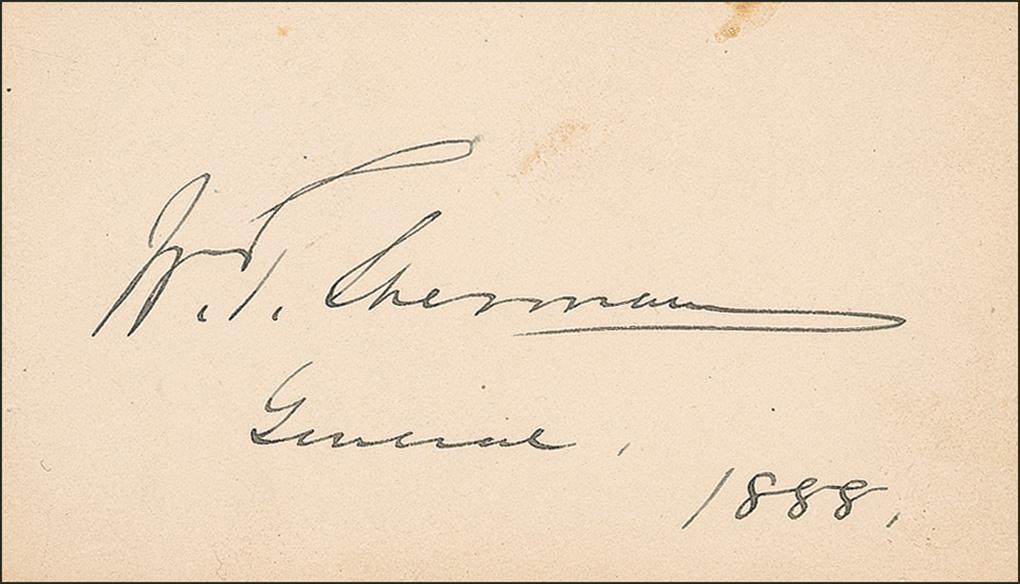 Sherman’s personal calling card, 3.5 x 2, with “W. T. Sherman—General—New York,” printed on the front, and signed on the reverse in black ink, “W. T. Sherman, General, 1888.” In fine condition, with a bit of scattered light foxing. Sherman enjoyed massive popularity, even long after his wartime heroics. The former commanding general acknowledged his wide-ranging esteem, and like most prominent men of his era, Sherman found it incumbent upon himself to carry calling cards.