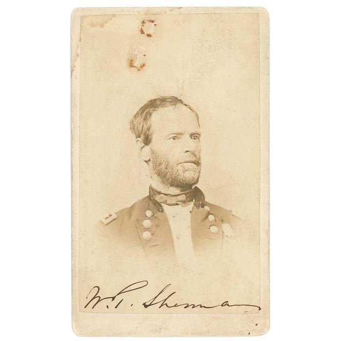 Vintage 2.5 x 4 carte-de-visite head-and-shoulders photo by S. M. Fassett of Chicago, signed at the bottom of the image in black ink, “W. T. Sherman.” In very good condition, with scattered light toning and soiling, and a rusty paperclip impression to top edge, resulting in some light surface loss to background. Pre-certified PSA/DNA and RRAuction COA.