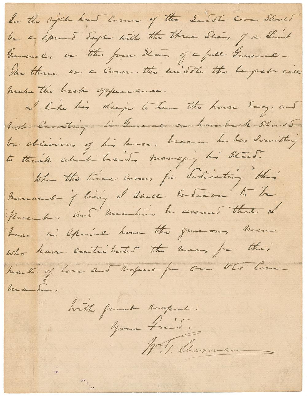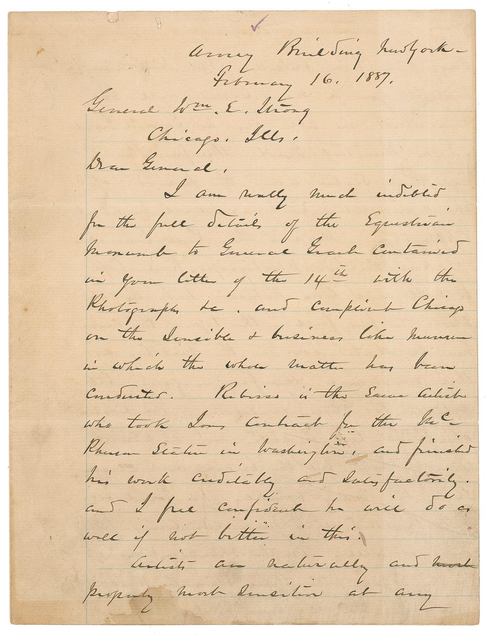 ALS signed “W. T. Sherman,” four pages, lightly-lined on two adjoining sheets, 8 x 10.5, February 16, 1887. Letter to General William Strong. In part: “I am really much indebted for the full details of the Equestrian monument to General Grant contained in your letter of the 14th with the photographs &c and compliment Chicago on the sensible and business like manner in which the whole matter has been conducted. Rebisso is the same artist who took some contract for the McPherson statue in Washington, and finished his work creditably and satisfactorily, and I feel confident he will do as well if not better in this.