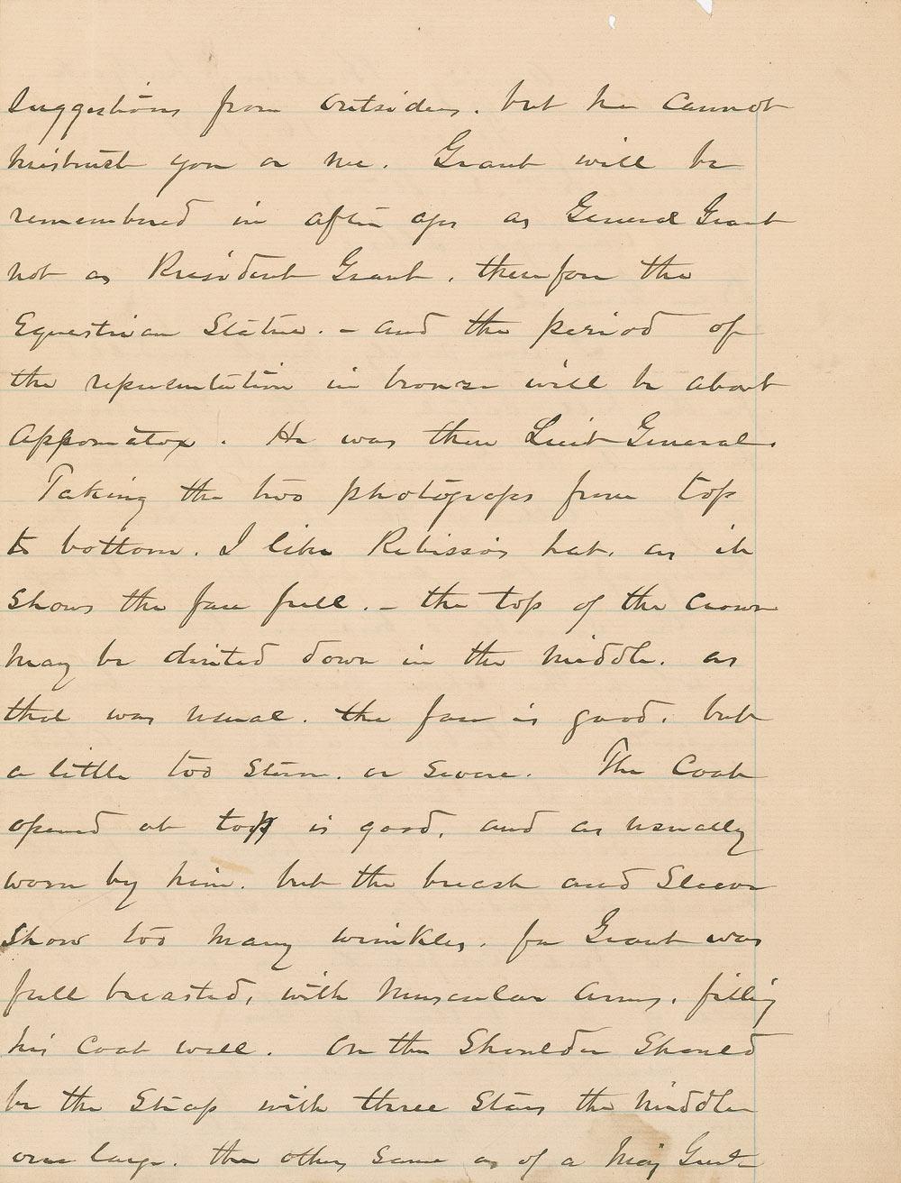 Artists are naturally and most properly most sensitive at any suggestions from outsiders, but he cannot mistrust you or me. Grant will be remembered in after ages as General Grant not as President Grant, therefore the equestrian statue - and the period of the representation in bronze will be about Appomatox. He was then Lieut. General.