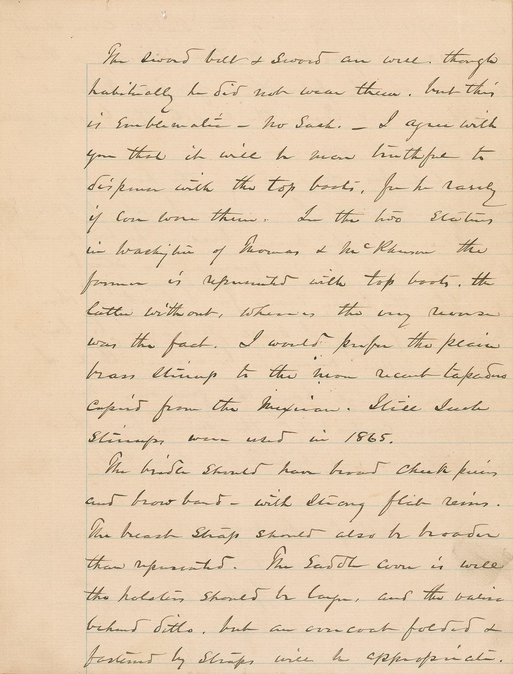 The bridle should have broad cheek pieces and brow band - with strong flat reins. The breast strap should also be broader than represented. The saddle case is well the holster should be larger, and the valise behind ditto. But an overcoat folded & fastened by straps will be appropriate. In the right hand corner of the saddle case should be a spread eagle with the three stars of a Lieut. General, or the four stars of a full General. The three on a curve, the middle the largest will make the best appearance.