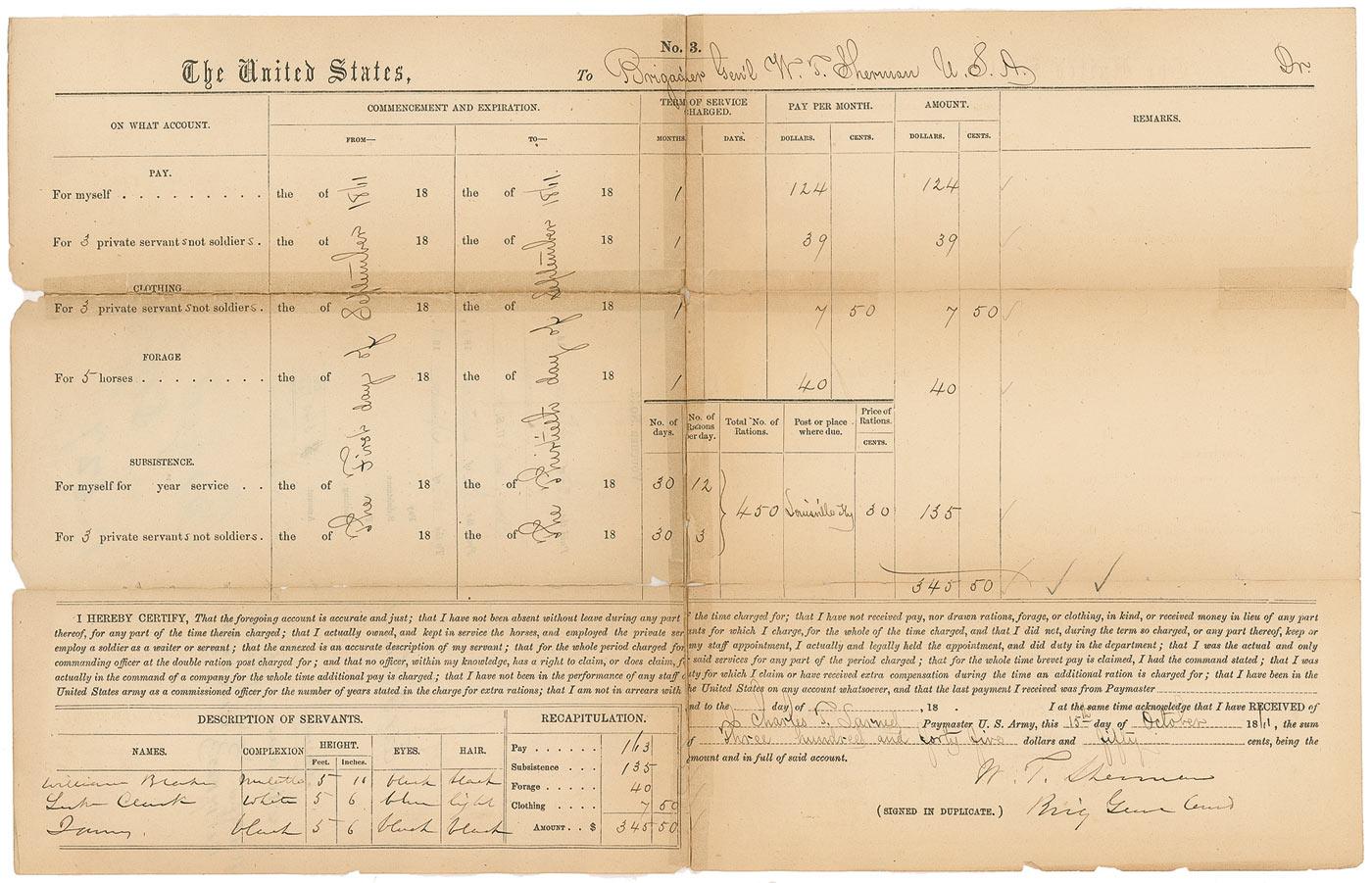 Partly-printed DS, signed “W. T. Sherman,” one page, 15.75 x 10, October 15, 1861. Civil War voucher for pay and clothing for three of Sherman’s servants. In good condition, with light toning, rippling to edges, separation and some areas of paper loss along two of the storage folds, and both old tape repair and professional repair along the folds. Pre-certified PSA/DNA and RRAuction COA.
