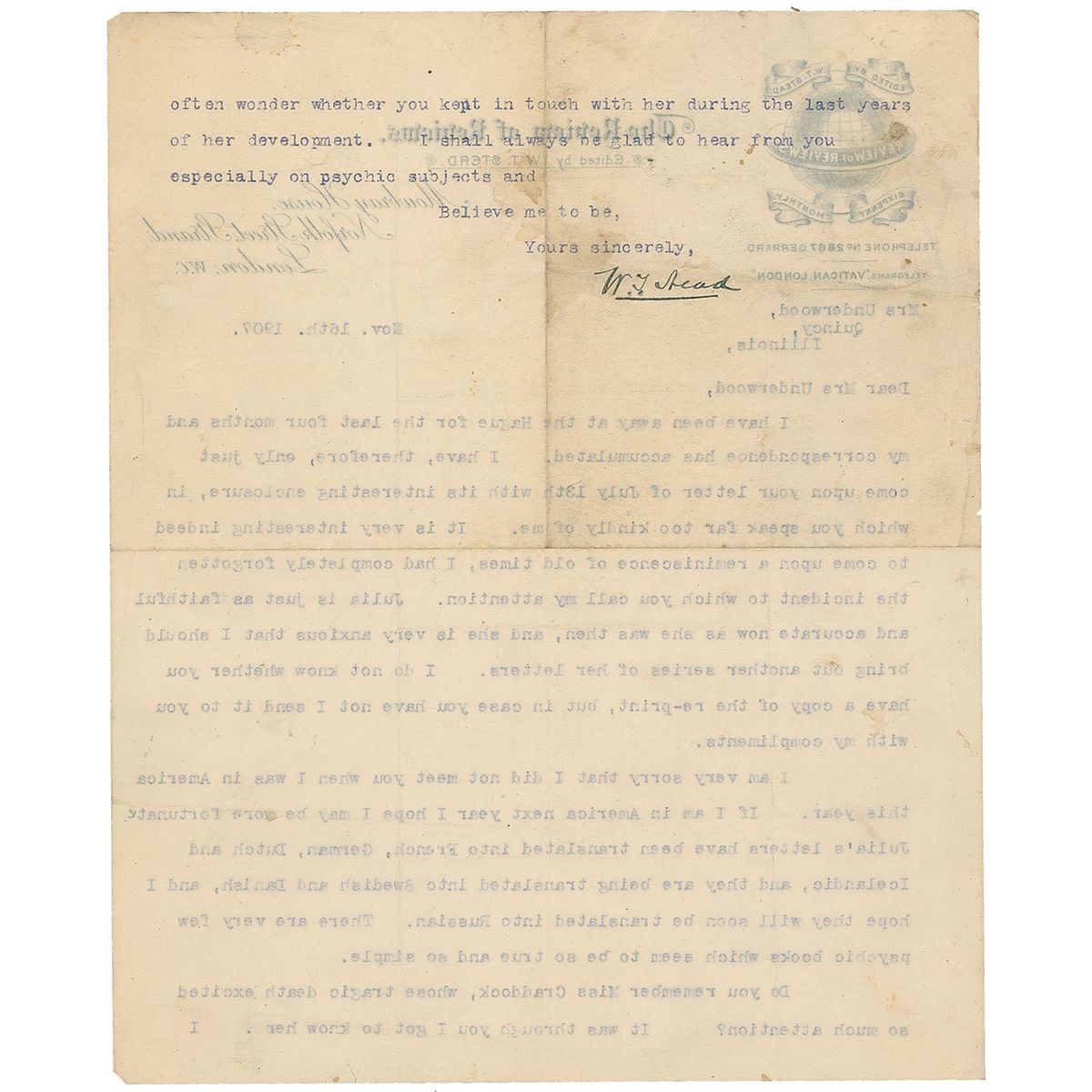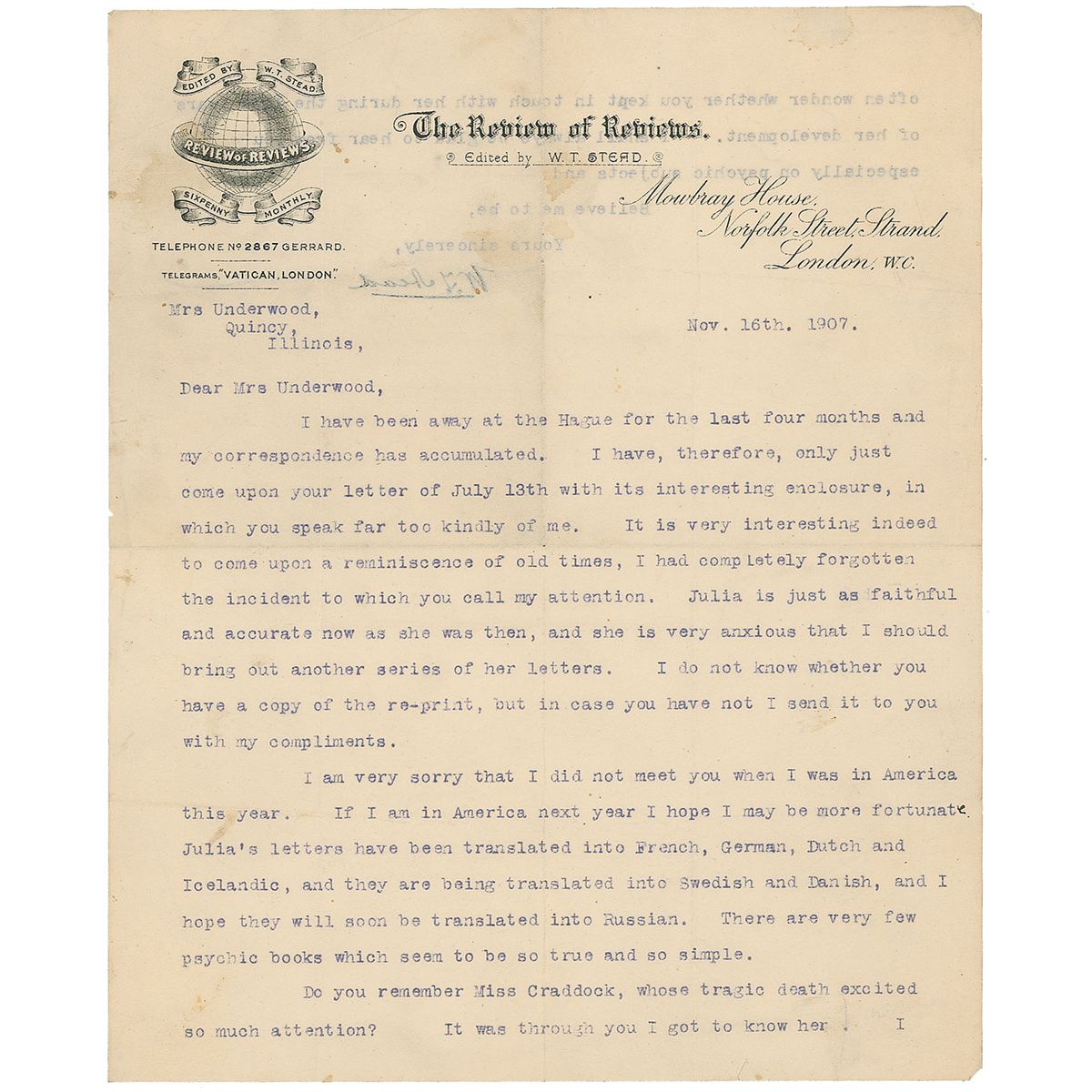 Journalist (1849–1912), assistant editor of the Pall Mall Gazette, and founder of The Review of Reviews who perished in the Titanic disaster. TLS signed “W. T. Snead,” one page both sides, 8 x 10, The Review of Reviews letterhead, November 16, 1907. Letter to Mrs. Underwood. In part: “It is very interesting indeed to come upon a reminiscence of old times, I had completely forgotten the incident to which you call to my attention. Julia is just as faithful and accurate now as she was then, and she is very anxious that I should bring out another series of letters…If I am in America next year I hope I may be more fortunate. Julia’s letters have been translated into French, German, Dutch, and Icelandic…There are very few psychic books which seem to be so true and so simple.” Intersecting folds, and an area of light soiling over signature, otherwise fine condition. During the 1890s, Stead showed an increased interest in spiritualism. He ran a quarterly magazine on the subject from 1893–97 and his spirit contact was alleged to be the departed Julia Ames, an American temperance reformer and journalist whom he met in 1890. Ex. Brian Green Collection.