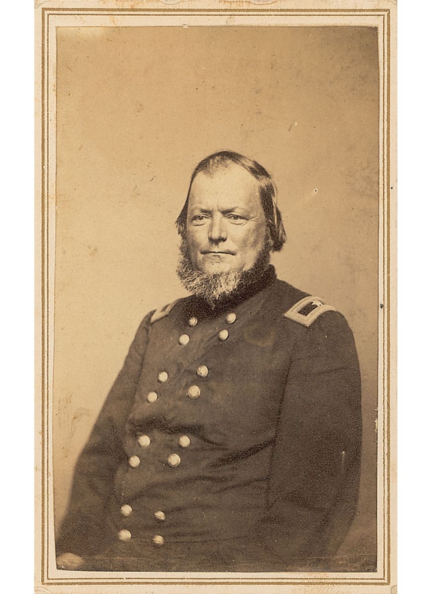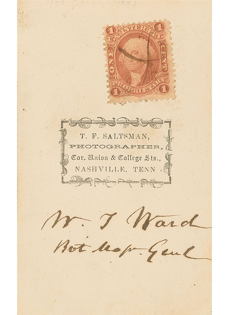 Union brigadier general who led a brigade in XX Corps during the early stages of the Atlanta Campaign (1808–1878). Original 2.5 x 4 carte-de-visite portrait by T. F. Saltsman of Tennessee, signed on the reverse in black ink, “W. T. Ward, Bvt. Maj. Genl.” In fine condition, with some chipping to edges and a revenue stamp affixed to reverse.