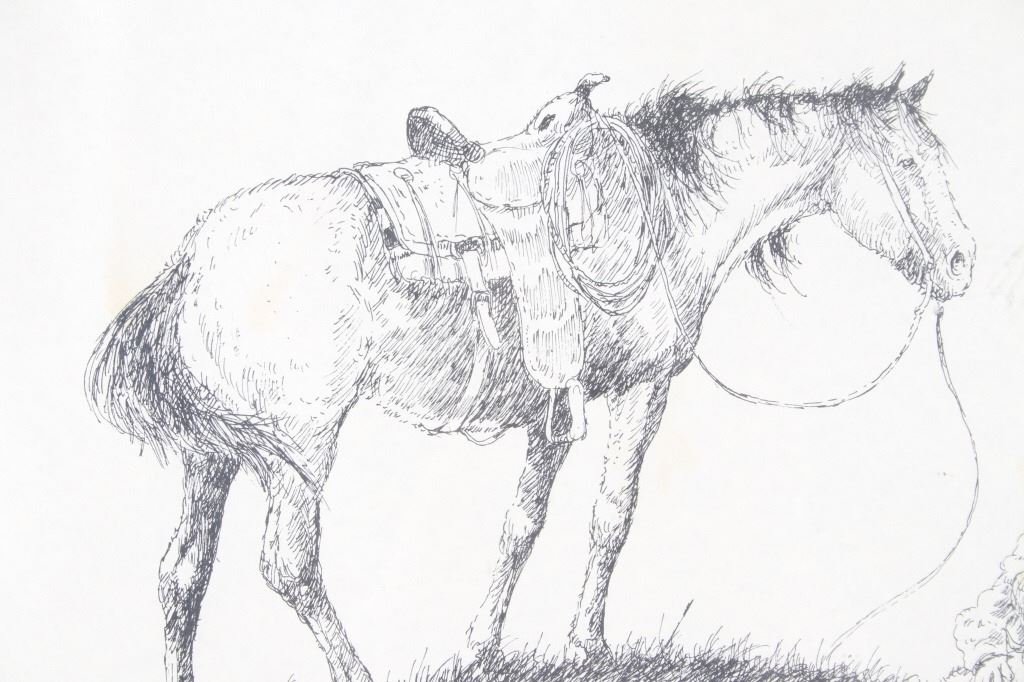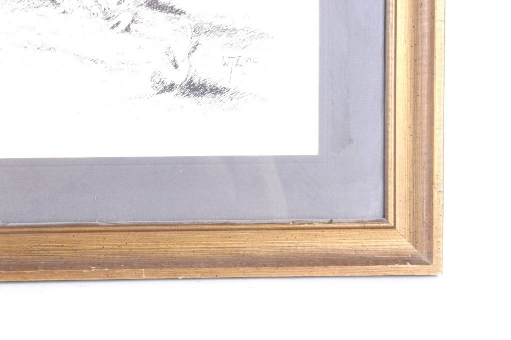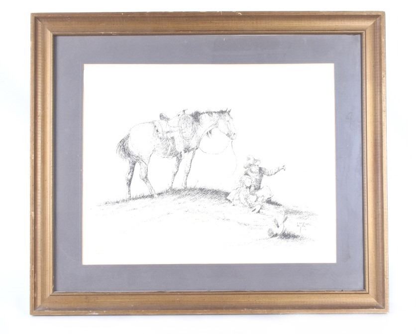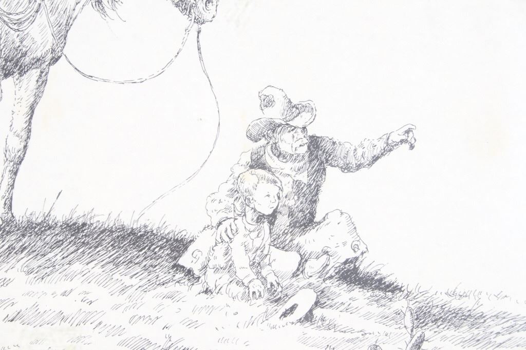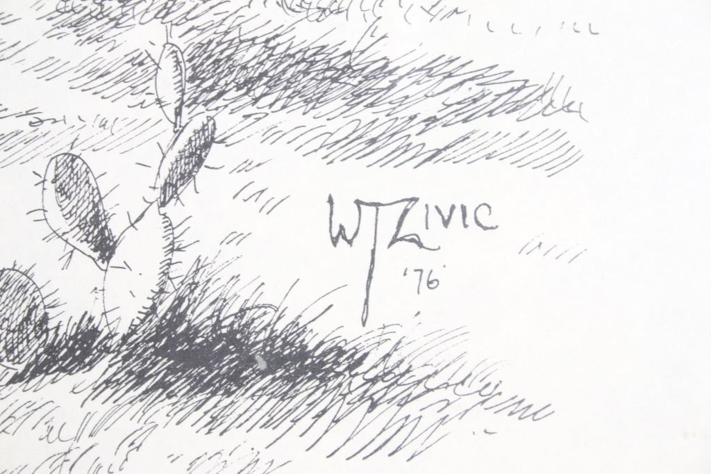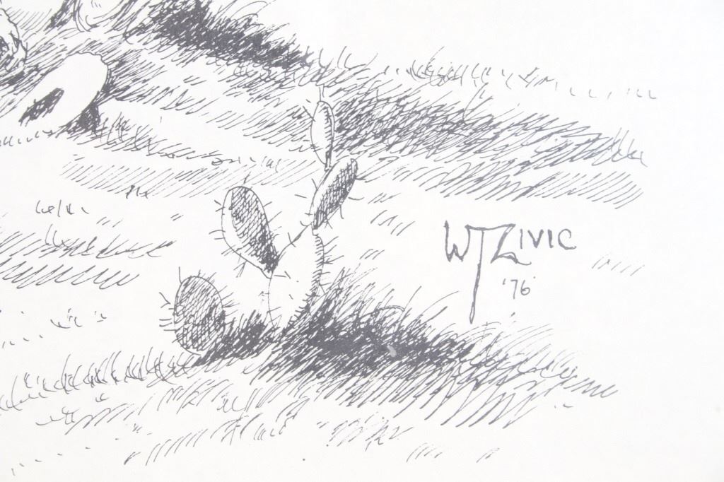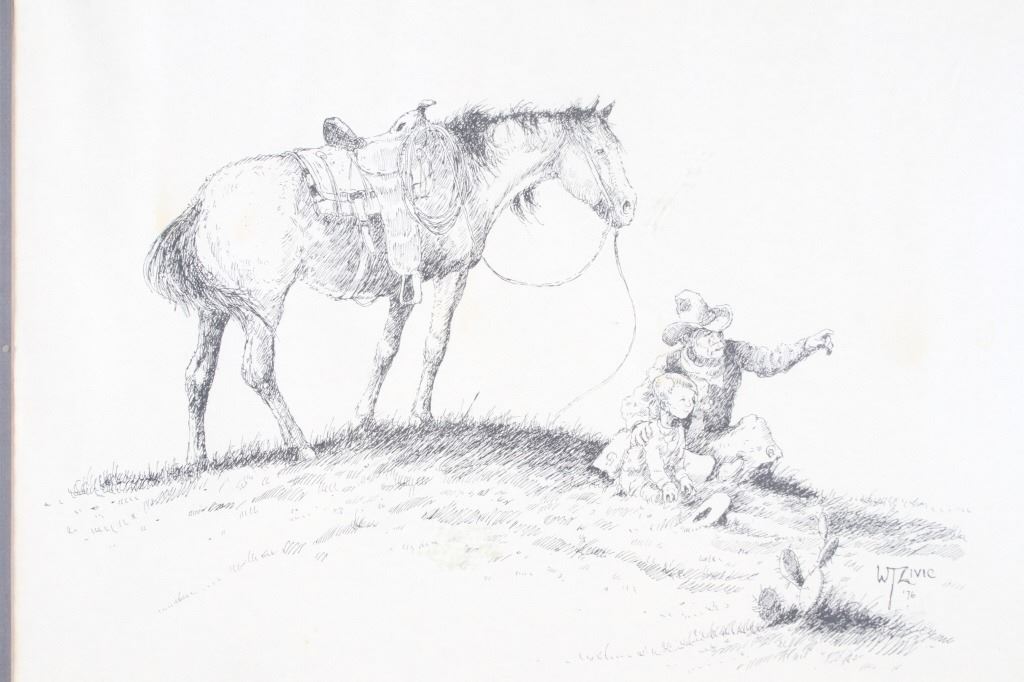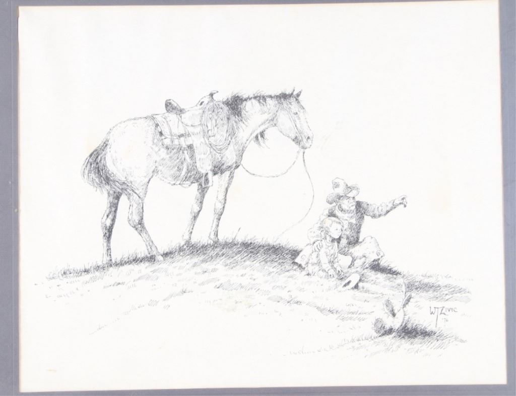 For your consideration is this lithograph of William T. Zivic's work from 1971. William Zivic is an American artist, soldier, merchant seaman, iron miner, lawman, and world traveler. He is captivated by the beauty of the American west and is known for his award winning Western art found in many fine art galleries. His works are displayed in both public and private collections and can be found in every state of the union as well as in many foreign countries. The lithograph depicts a rancher pointing something out in the distance to a young boy, possibly his son, as his horse stands behind them. The litho is signed on the bottom right hand corner reading, "W T Zivic 76". The litho sits in a wood frame, behind glass and is single matted. The art measures 15 1/4" L x 19 3/8" W, while the entire piece measures 23" L x 27 1/4" W.