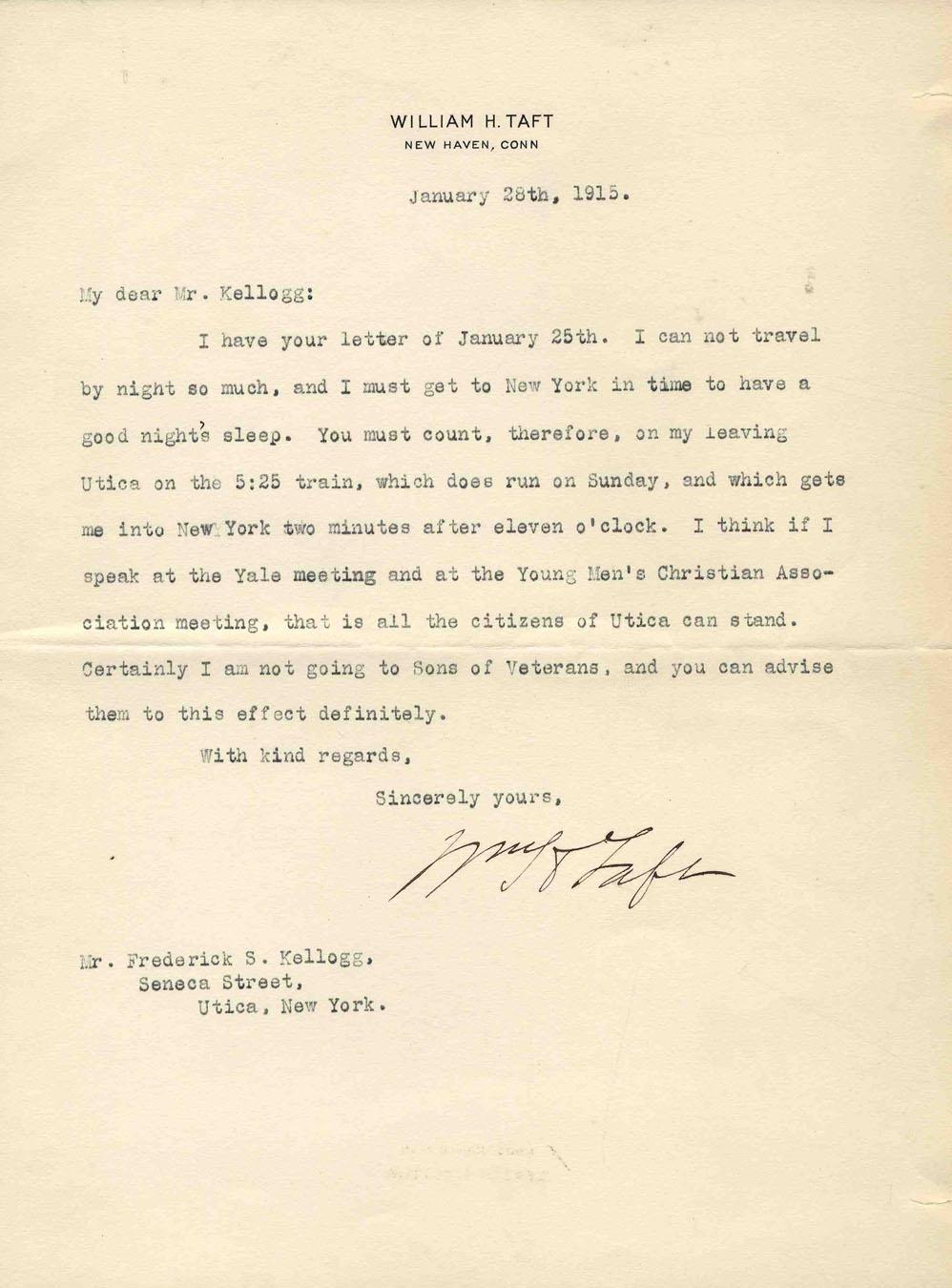 President William Taft typed letter signed to Frederick S. Kellogg. Dated 28 January 1915 on personal letterhead, it reads in part: ''…I must get to New York in time to have a good nights' sleep. You must count, therefore, on my leaving Utica on the 5:25 train…if I speak at the Yale meeting and at the Young Man's Christian Association meeting, that is all the citizens of Utica can stand…Sincerely yours, Wm. Taft.'' 1pp. measures 7'' x 9.25''. Mailing folds and tiny tears to top & bottom right margins. Very good condition.
