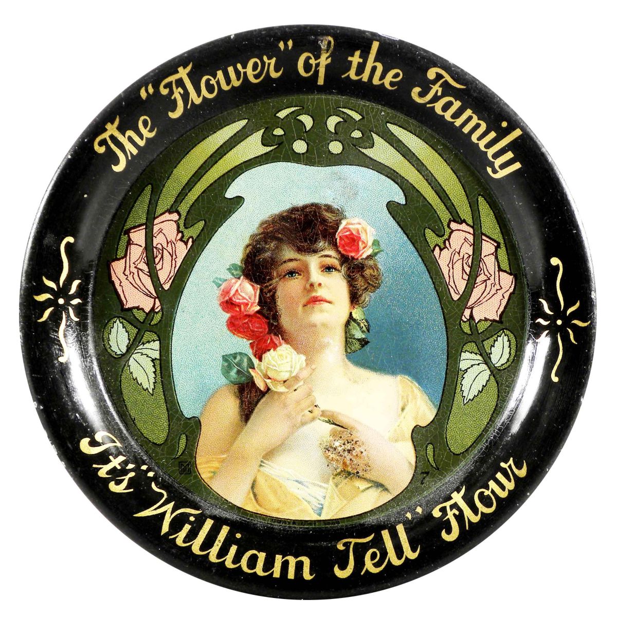 William Tell Flour Tin Tip Tray. Entitled, "The Flower of the Family". Normal crazing and price sticker residue on her hand otherwise very good condition. 4 1/4 inch diameter.