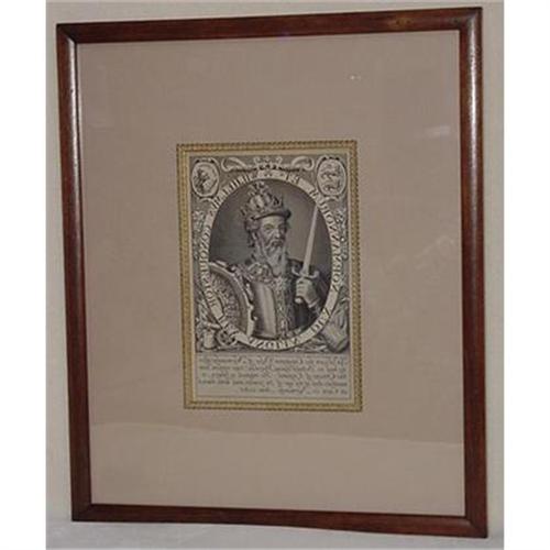 A framed engraving of William the Conqueror, a simple wood frame, 15" X 18" holds the exquisitely detailed engraving surrounded by a gold leaf matt liner. The engraving is a beautiful work of art in its styling and detail. For any fan of William, Duke of Normandy, this is a must have.