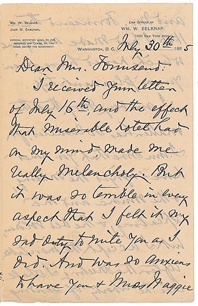 Union general and secretary of war under Grant (1829–1890). Inadvertently, Belknap almost saved Custer from his fate at Little Bighorn, when Custer became embroiled in the scandal that resulted in Belknap’s impeachment and Grant’s censure of Custer. ALS s