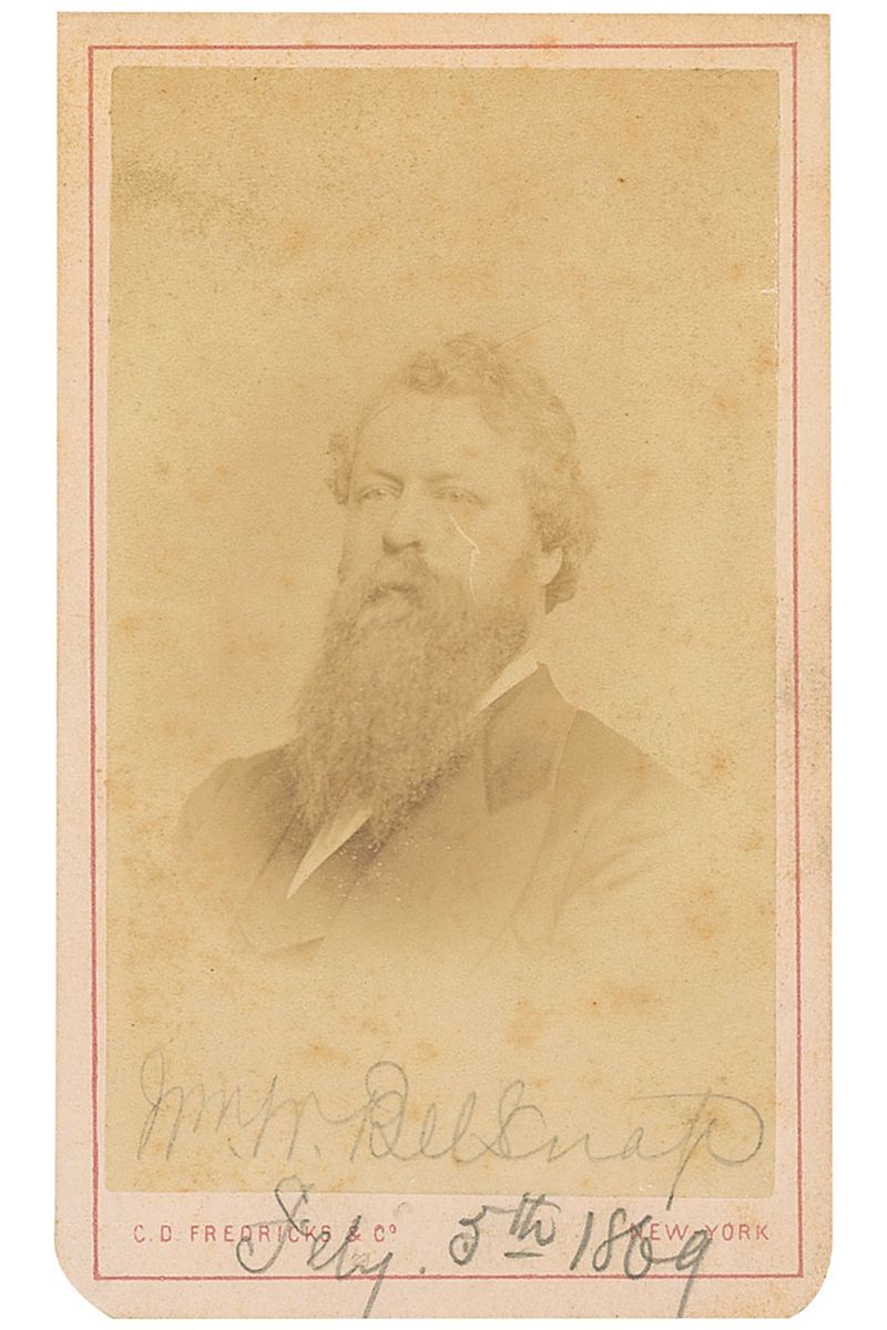 Original 2.5 x 4 carte-de-visite bust portrait of Belknap, by C. D. Fredricks & Co. of New York, signed at the bottom in pencil, “Wm. W. Belknap, Feby. 5th, 1869.” Reverse bears note in pencil from his second wife, “Compliments of Carita S. Belknap.” In very good condition, with scattered foxing to the slightly faded image, and clipped lower corners.