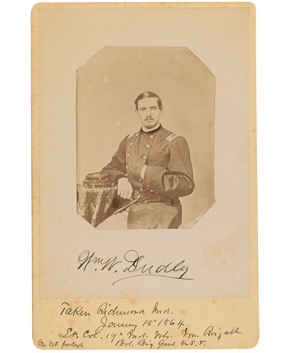 Union officer and a commander of the famed Iron Brigade. He lost almost 80 percent of his men at Gettysburg, as well as his right leg. Original 4 x 6.5 cabinet photo, signed in black ink under the image, “Wm. W. Dudley,” with date of photo and his military information added in another hand to the bottom border. Backing having been removed and some scattered light toning, otherwise fine condition.