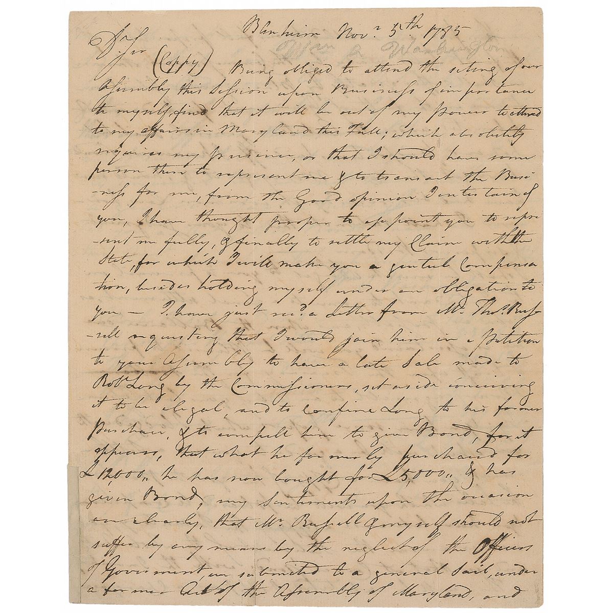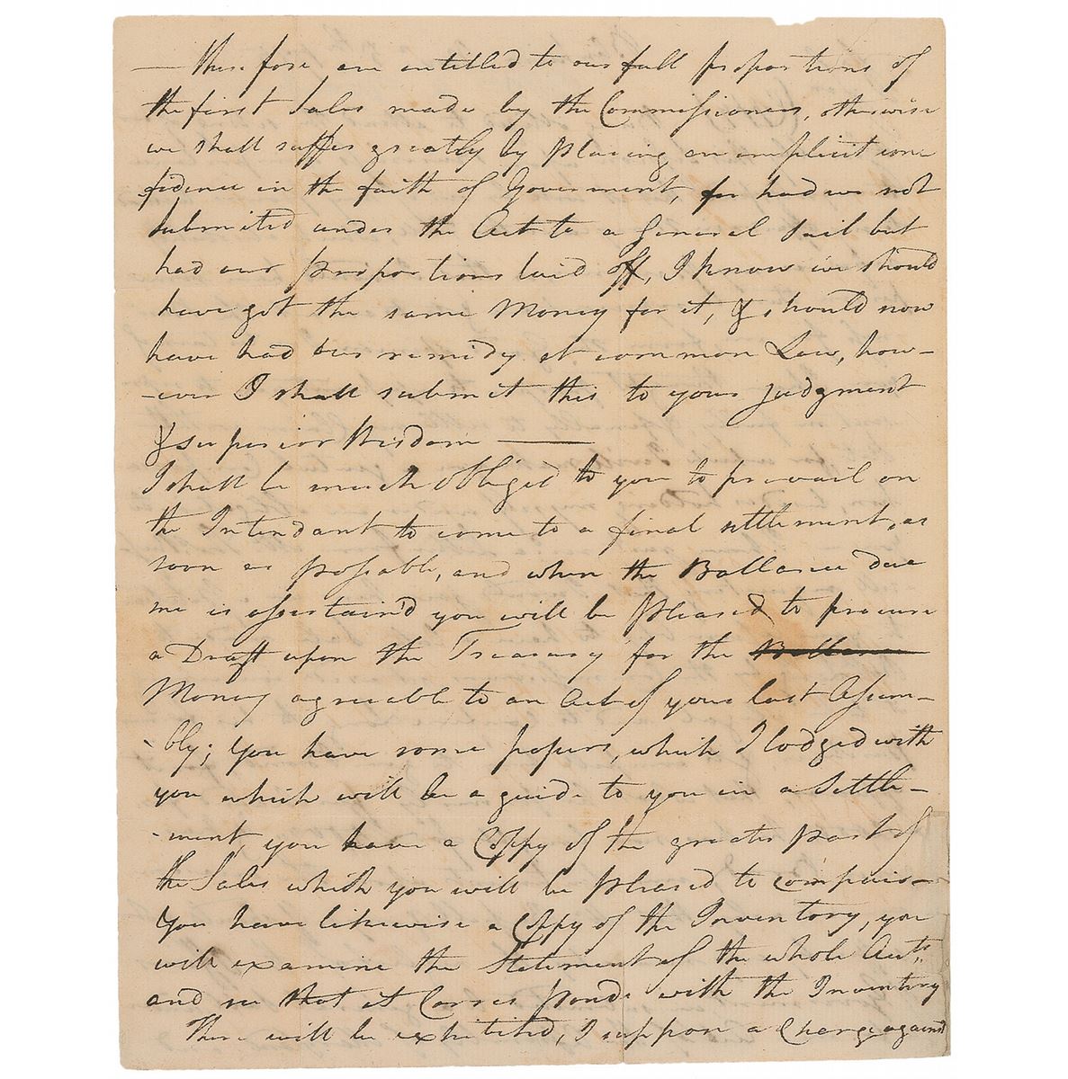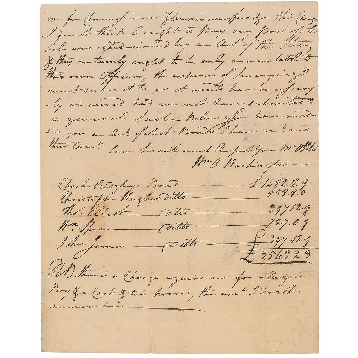 Officer of the Continental Army during the American Revolutionary War (1752–1810) and second cousin to President George Washington. Lengthy ALS signed “Wm. A. Washington,” three pages on two adjoining sheets, 7.25 x 9, November 5, 1785. Letter to Thomas Stone, in part: “I have thought proper to appoint you to represent me fully, & finally to settle my Claim with the State…I shall be much obliged to you to prevail on the Intendant to come to a final settlement as soon as possible.” Addressed on the reverse of the second integral page in his own hand. In very good condition, with partial separations to intersecting folds (one vertical fold passing through a single letter of the signature), scattered spots of discoloration, a few small areas of ink erosion, and slight show-through from writing to opposing sides.