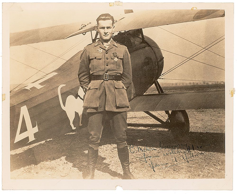 Vintage glossy 10 x 8 photo of Wellman, dressed in full military uniform, posing in front of his biplane, signed and inscribed in fountain pen “C. Melvin Greenway, from another old man, William A. Wellman.” In very good condition, with a few scattered creases, tape remnants to three edges, small area of paper loss to bottom edge, and a bit of light contrast to a portion of signature and inscription. Accompanied by two typed biographies.