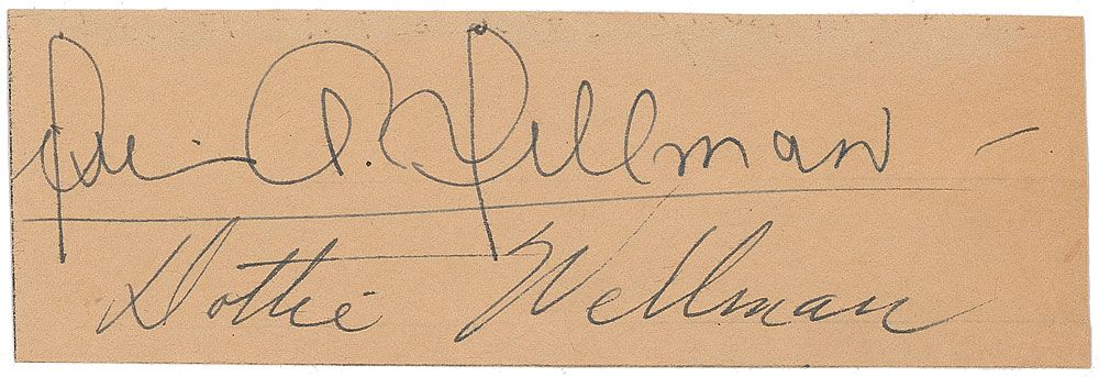 American film director (1896–1975) who helmed such classics as Wings, The Public Enemy, and the original version of A Star Is Born. Vintage fountain pen signature, “Wm. A. Wellman,” on an off-white 5.5 x 1.75 card. Also signed by his wife, “Dottie Wellman.” In fine condition, with a uniform shade of toning.