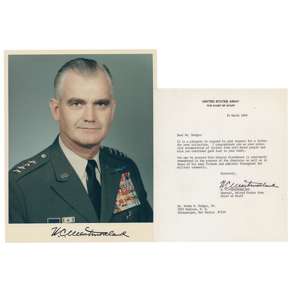Two items: a color glossy 8 x 10 photo of Westmoreland in uniform, signed in the lower border in black felt tip, "W. C. Westmoreland'; and a TLS signed "W. C. Westmoreland," one page, 7 x 8, United States Army Chief of Staff letterhead, March 24, 1969, in part: "You may be assured that General Eisenhower is constantly remembered in the prayers of the chaplains as well as in those of his many friends and admirers throughout the military community." In overall fine condition.
