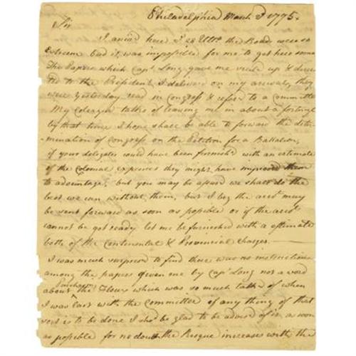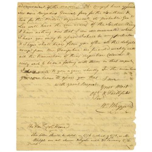 <B>William Whipple Autograph Letter Signed</B></I> <I>"Wm. Whipple,"</B></I> two pages, 7.25" x 9", front and verso. Philadelphia, March 2, <B>1776</B></I> (but inexplicably dated 1775 - see below). To Honble Col. Meshech Weare. Original spelling. In full, <I>"I arriv'd here ye 28 Ulto the Roads were so Extreem bad it was impossible for me to get here sooner. The Papers which Capt Long gave me seald up & directed to the President </B></I> John Hancock <I>I delivered on my arrival, they were yesterday read in Congress & referd to a Committee. My Coleague talks of leaving me in about a fortnight by that time I hope shall be able to forward the determination of Congress on the Petition for a Battalion, if your delegates could have been furnish'd with an estimate of the Colonial expences they might have improved them to advantage, but you may be assured we shall do the best we can without them, but I beg the acco</B></I> un <I>t may be sent forward as soon as possible or if the acco</B></I> un <I>ts cannot be got ready let me be furnished with a estimate both of the Continental & Provincial charges. I was much surprisd to find there was no instructions among the papers given me by Capt Long not a word about Purchasing the Flour which was so much talked of when I was last with the Committee if any thing of that sort is to be done I shod be glad to be advisd of it, as soon as possible for no doubt the Risque increases with the advancement of the season. The Congress have appointed six more Brigadier Generals four for the Southern & two for the Middle departments, its probable Genl. Lee will have the Command of the Southern Army. I have nothing new that I can communicate when I have you may be assured I shall be very particular & I hope shall hear from you often all the delegates except from New-Hampshire are furnishd weakly with all the transactions of their respective Colonies, & realy wish to be on a footing with them in that respect. I shall write to you again shortly In the meantime give me leave to assure you that I am with great Respect Your Most Obt. & Faithful Servt."</B></I> Penned across the bottom in an unidentified contemporary hand: <I>"This letter should be dated in 1776 instead of 1775, as Mr. Whipple was not chosen Delegate until 23 January 1776."<BR></B></I><BR>From the <I>Journals of the Continental Congress</B></I> for Friday, March 1, 1776: "A letter from the committee of safety of New Hampshire, with a petition from said colony, and sundry other papers, were read: Resolved, That the same be referred to a committee of three. The members chosen, Mr. George Wythe, Mr. Carter Braxton, and Mr. <B>enjamin Franklin." Footnote: "William Whipple reached Philadelphia on the 28th February, bringing these papers." There is no doubt whatsoever that this letter was penned by William Whipple in 1776 prior to his signing the Declaration of Independence. The appointments mentioned by Whipple are also recorded in the <I>Journals</B></I> of March 1, 1776.<BR><BR>On January 5, 1776, New Hampshire became the first American colony to adopt a formal constitution which served as the basic instrument of government until the state adopted a new constitution in 1784. Executive power was delegated to a Committee of Safety consisting of eight or ten legislative leaders. <B>Col. Meshech Weare</B></I> (1713-1786) was elected chairman of the Committee of Safety and, on June 15, 1776, became the first President (now called Governor) of New Hampshire, serving until June 1, 1785. Chipping at the left edge of the first page does not affect any of Whipple's writing. There is a 3" separation at the right of the lower fold not materially affecting the letter's appearance. Penned exactly four months before Congress voted to approve the resolution "That these United Colonies are, and, of right, ought to be, Free and Independent States; that they are absolved from all allegiance to the British crown, and that all political connexion sic between them, and the state of Great Britain, is, and ought to be, totally dissolved." A superb content letter of the workings of Congress relative to military appointments prior to independence during the first year of the American Revolution, written by a newly elected member of the Continental Congress upon his arrival in Philadelphia. In fine condition.<BR><BR><b>Shipping:</b> Flat Material, Small (<a target="_blank" href="http://www.heritageauctions.com/common/shipping.php">view shipping information</a>)