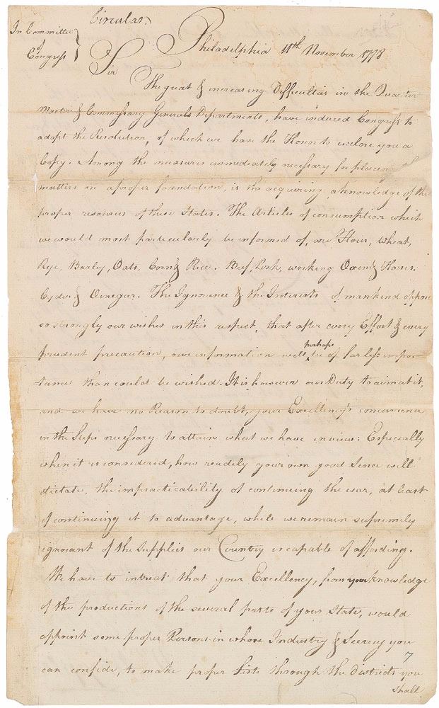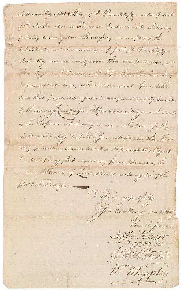 Rare Revolutionary War–dated manuscript DS, signed “Wm. Whipple,” "Gouv. Morris," and "Nath'l Scudder," one page both sides, 7.25 x 12, November 11, 1778. Circular letter signed by William Whipple, Gouverneur Morris, and Nathaniel Scudder, one day after they were appointed by Continental Congress to a special committee to oversee the commissary and quartermaster departments, which were plagued by supply chain problems. They sent this rousing circular letter to each state's governor plus Continental Congress President Henry Laurens. In full: "The great & increasing difficulties in the Quarter Masters & Commissary Generals Departments, have induced Congress to adopt the Resolution, of which we have the Honor to enclose you a Copy. Among the measures immediately necessary for placing [these] matters on a proper foundation, is the acquiring a knowledge of the proper resources of these States. The Articles of consumption which we would most particularly be informed of, are Flour, Wheat, Rye, Barley, Oats, Corn & Rice, Beef, Pork, working Oxen & Horses, Cyder & Vinegar. The Ignorance & the Interests of mankind oppose so strongly our wishes in this respect, that after every Effort & every prudent precaution, our information will perhaps be of far less importance than could be wished. It is however our Duty to aim at it, and we have no reason to doubt your Excellency’s Concurrence in the Steps necessary to attain what we have in view: Especially when it is considered, how readily your own good Sence will dictate, the impracticability of continuing the war, at least of continuing it to advantage, while we remain supremely ignorant of the Supplies our Country is capable of affording.